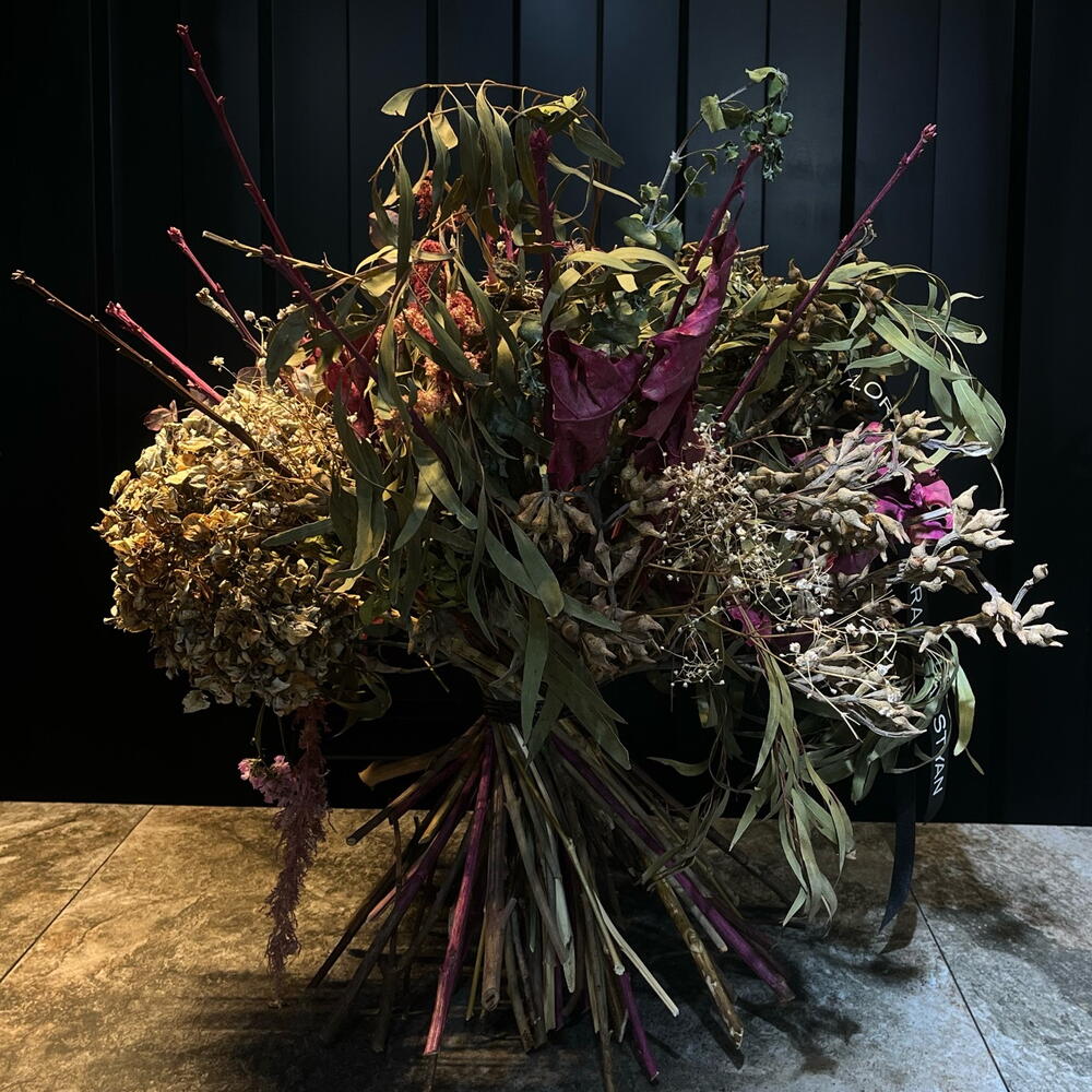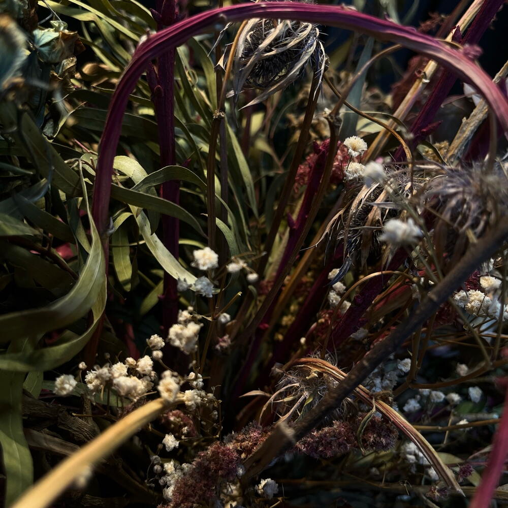 Este ramo seco es una mezcla preciosa de tonos rosados, dorados y verdes: parece un pequeño bosque otoñal enredado, con hojas crujidas, flores marchitas con encanto y ramas que se abren como un abanico rústico. Tiene una vibra artística, salvaje y elegante a la vez.