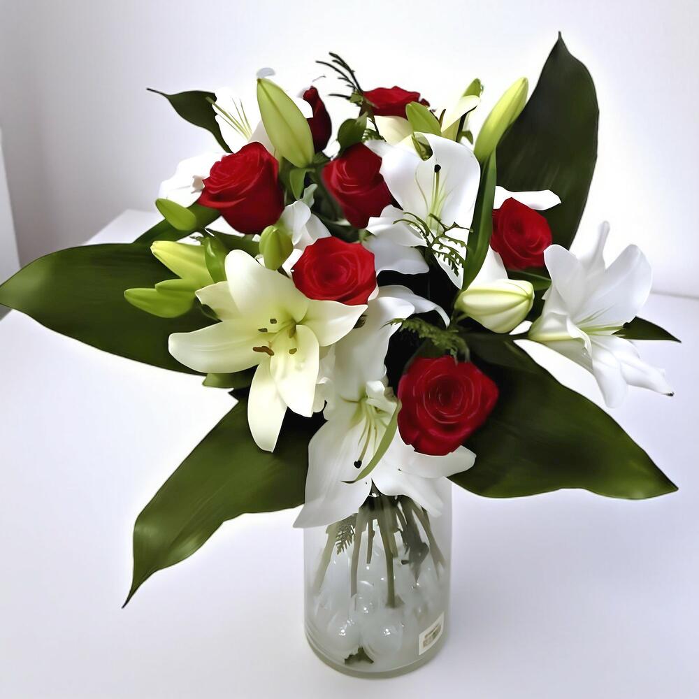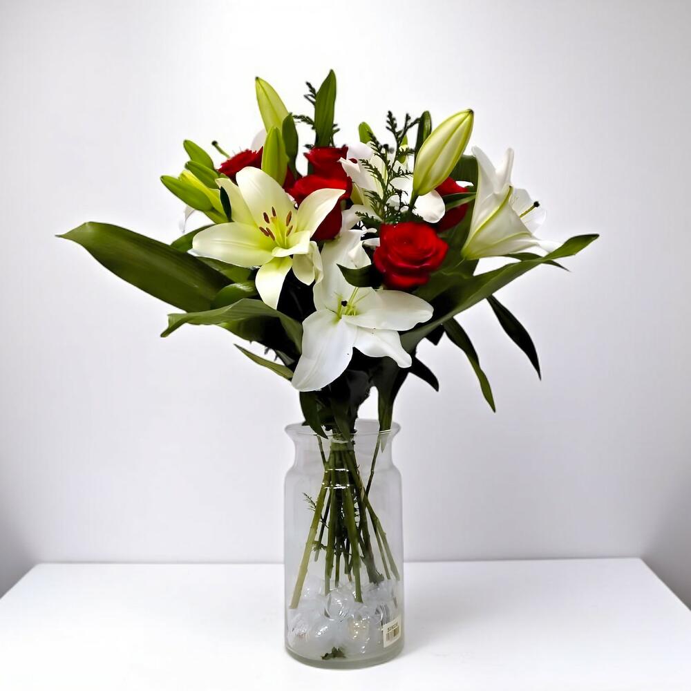 Este producto elegante de la categoría De Autor está compuesto por un hermoso arreglo floral. Incluye 4 unidades de hermosos lilium blancos que aportan belleza y elegancia, 4 unidades de rosas rojas que simbolizan el amor y la pasión, mientras que 3 tallos de paniculata agregan un toque único a este bouquet. Para equilibrar el diseño, se ha añadido 1 unidad de verde variado, que aporta naturalidad y frescura al conjunto. Este es el regalo perfecto para expresar tus sentimientos a tus seres queridos.