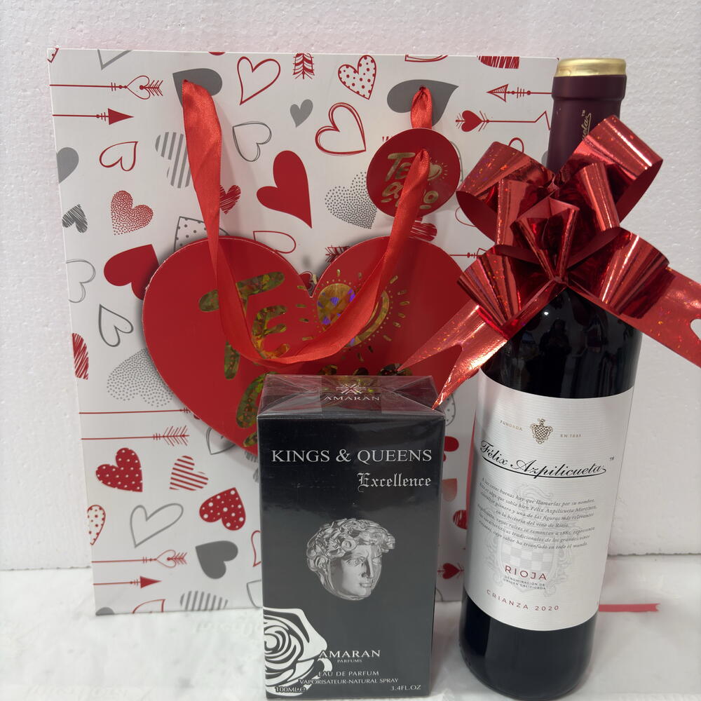 botella de vino tinto félix azpilicueta - 1 ud. bolsa con temática san valentín - 1 ud. moño para botella rojo - 1 ud. perfume kings queens excellent - 1 ud.