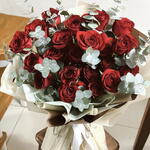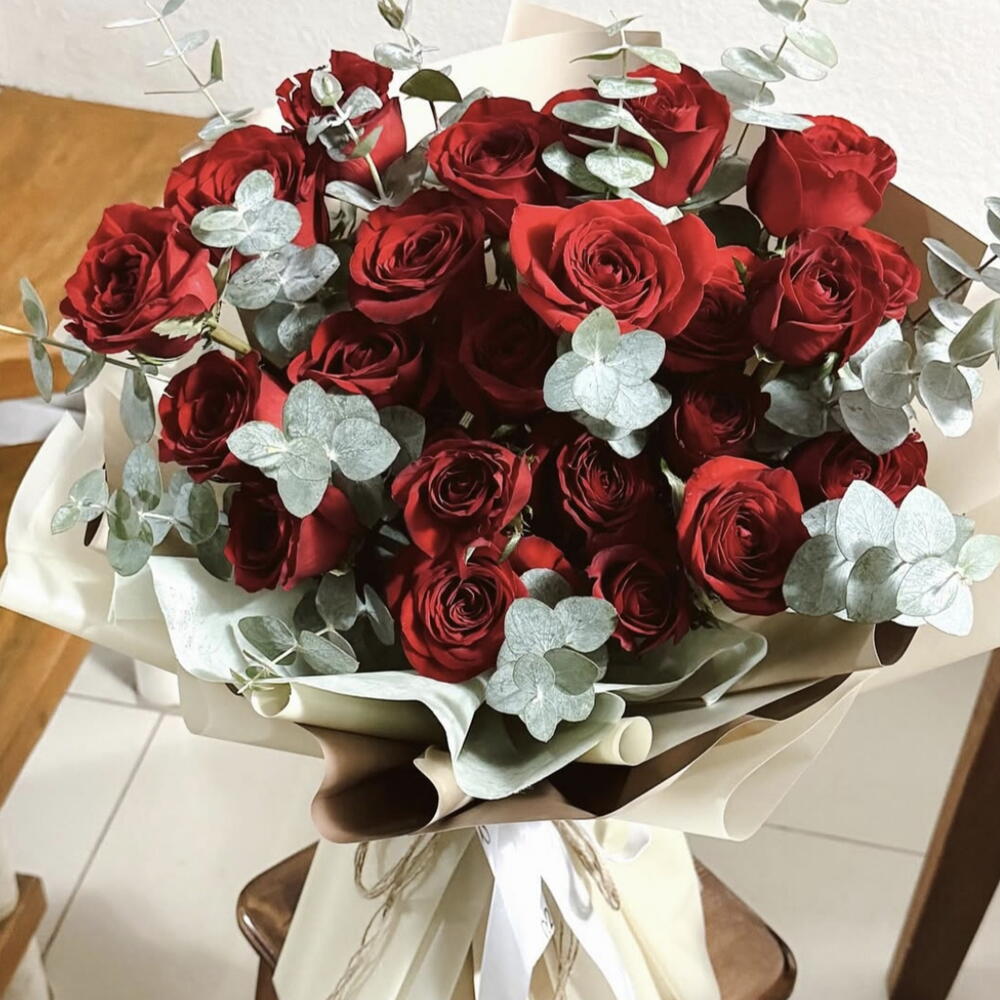 eucalipto - 1 ud. rosas rojas - 25 ud. lazo de cinta - 1 ud. papel coreano - 1 ud.