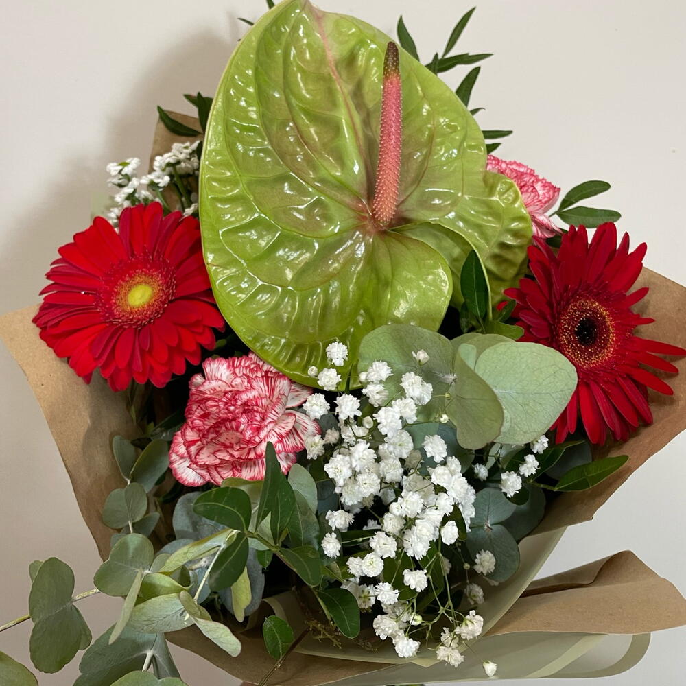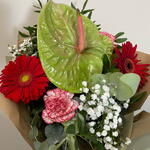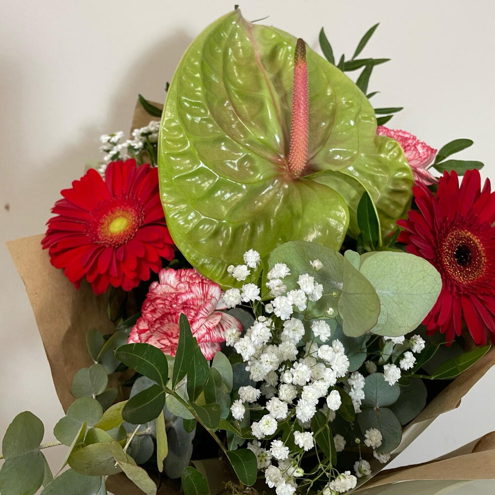 clavel - 3 ud. anthurium green - 1 ud. Gerbera roja - 1 ud. paniculata blanca - 1 ud. verde decorativo (follaje) - 1 ud.