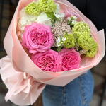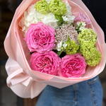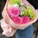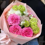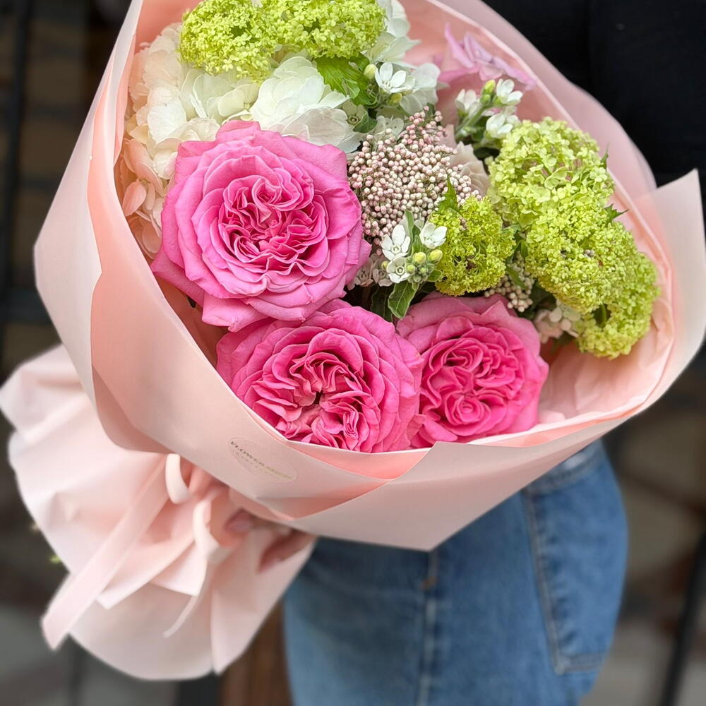 hortensia - 1 ud. flor de arroz - 3 ud. oxipetalum - 3 ud. viburno verde - 2 ud. rosa premium - 3 ud.