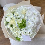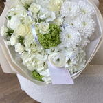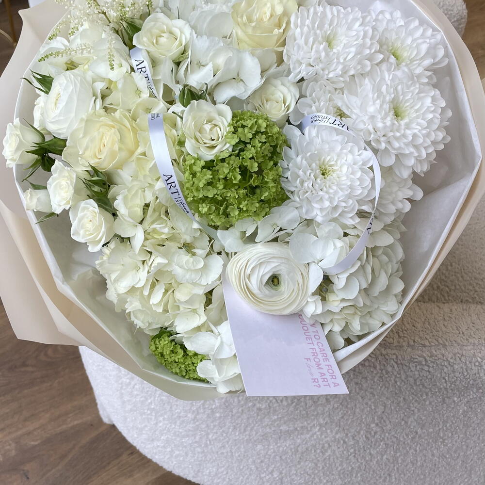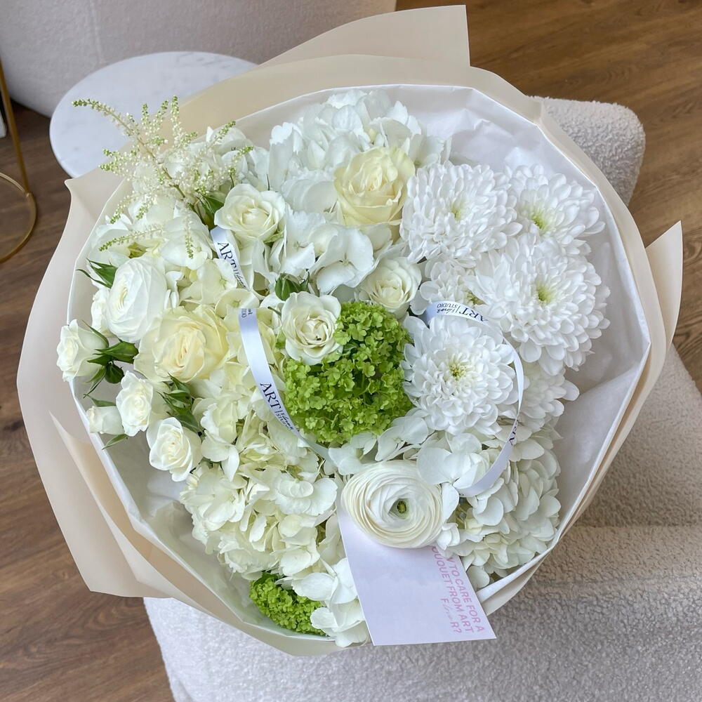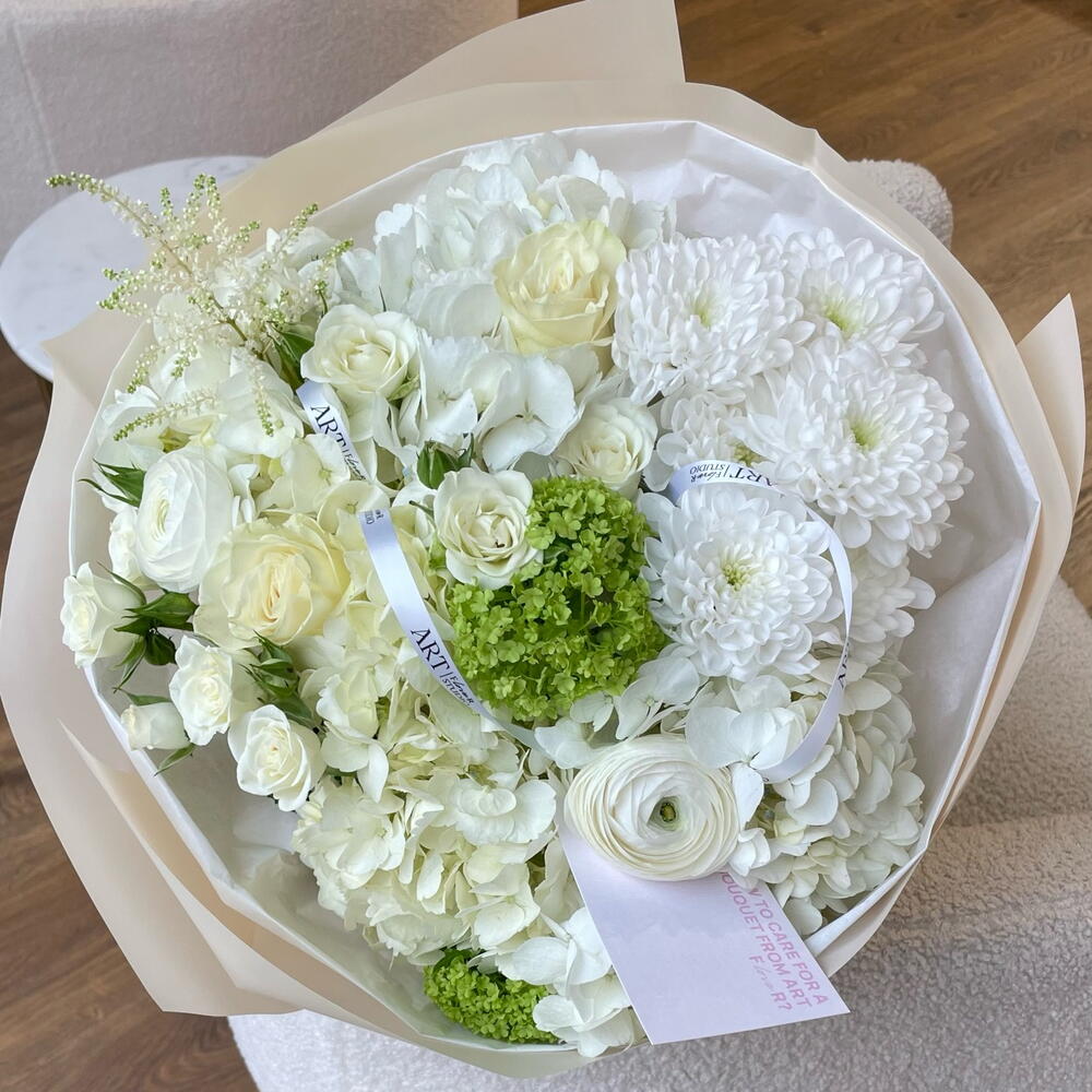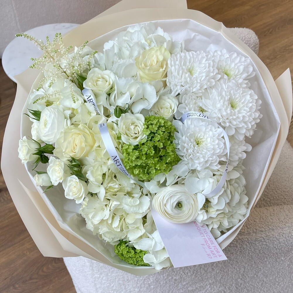 Spray rose - 2 ud. Viburnum - 1 ud. hortensia - 3 ud. ranunculus - 2 ud. astilbe - 1 ud. rosa mundial - 3 ud. crisantemo - 1 ud.