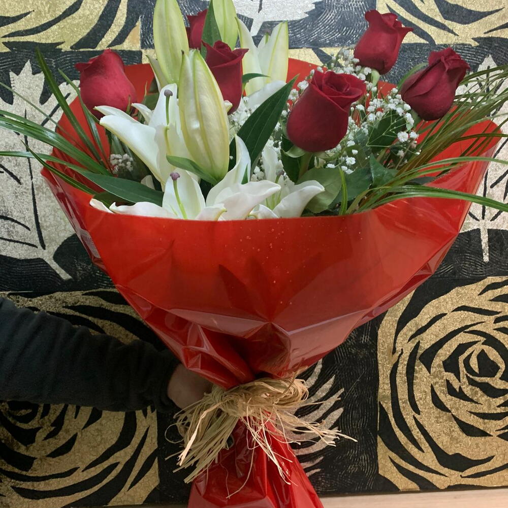 verdes - 5 ud. rosas rojas - 6 ud. lilium oriental blanco - 2 ud. lazo decorativo - 1 ud. papel decorativo - 1 ud. peniculata blanca - 3 ud.