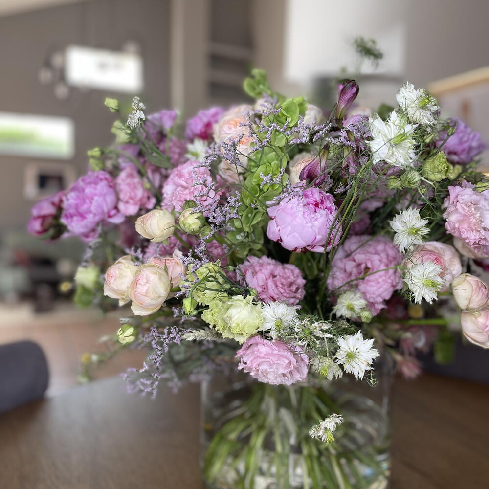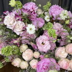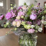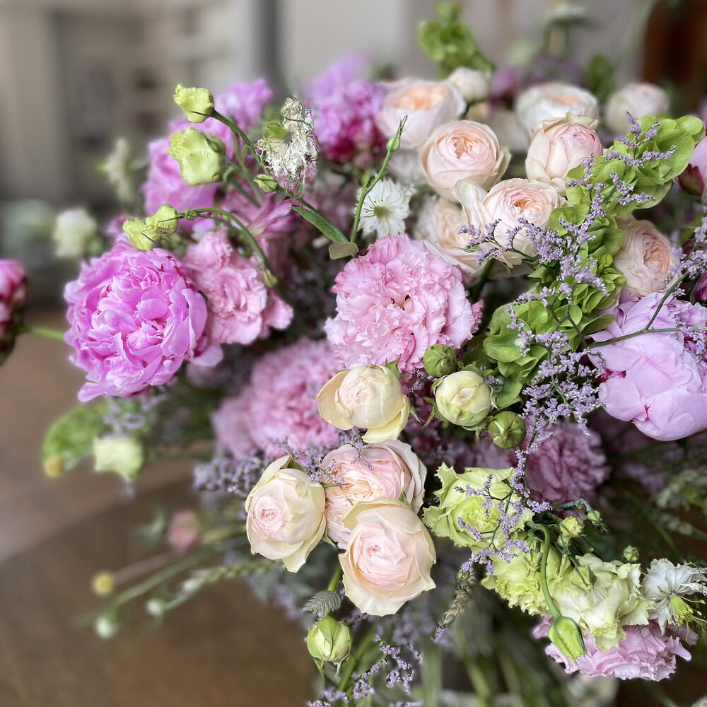La imagen muestra un hermoso ramo de flores.El arreglo está compuesto por una variedad de flores en tonos suaves y románticos, como rosado, lila, crema y verde claro. Algunas de las flores que se pueden identificar incluyen: • Rosas de jardín en tonos crema y rosa claro, con pétalos muy densos y aspecto aterciopelado. • Peonías de color rosa fuerte, con una forma redondeada y voluminosa. • Claveles rosados, que aportan textura con sus pétalos rizados. • Flor de estatice o limonium, que añade un toque lila y delicado. • Flores verdes, posiblemente lisianthus o botones florales, que añaden contraste y frescura al ramo. La composición del ramo transmite elegancia, suavidad y frescura, ideal para una decoración primaveral o un regalo especial.