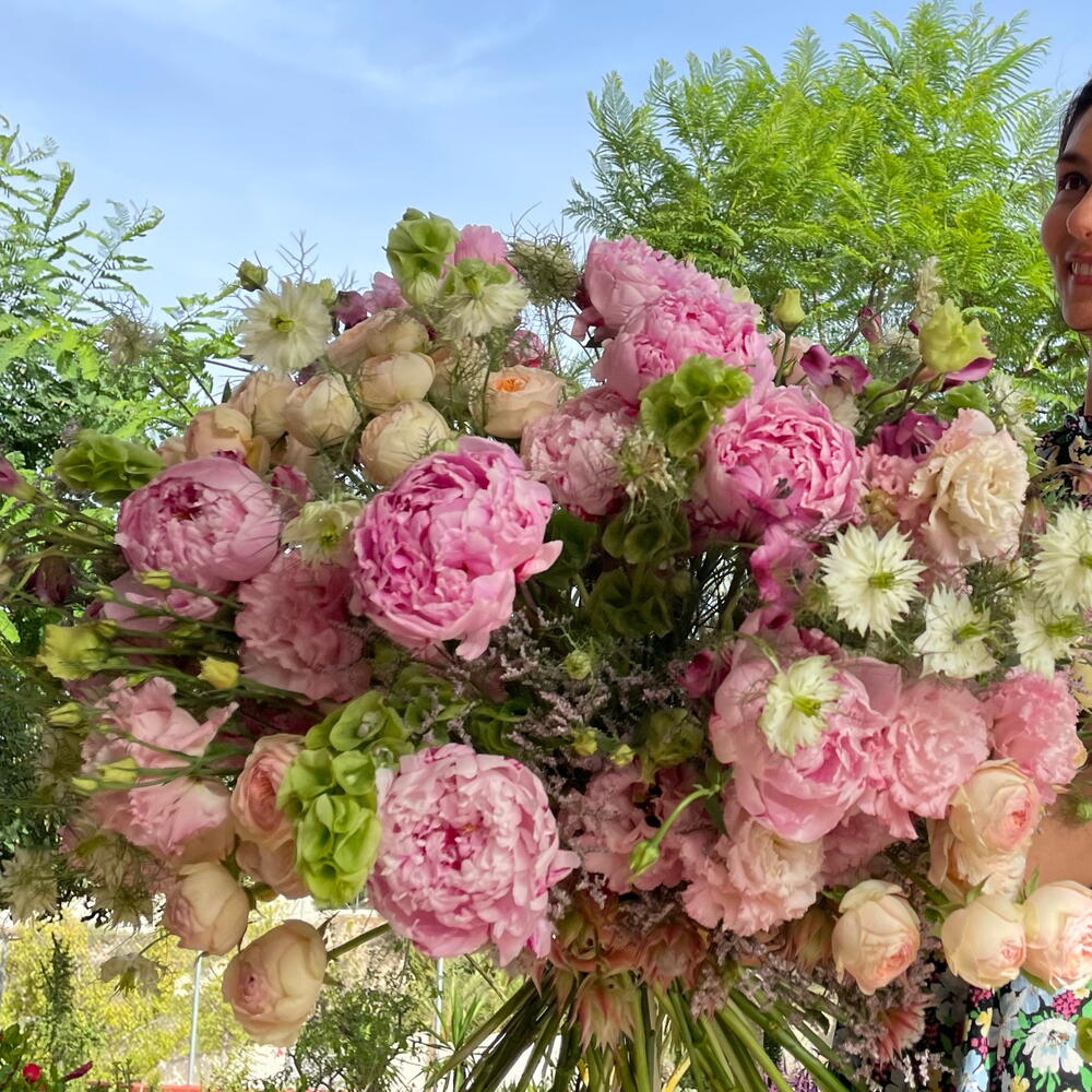 Lisianthus - 15 ud. limonium purple - 10 ud. peonías - 30 ud. moluccella - 5 ud. rosas ramificadas bombastic - 10 ud.