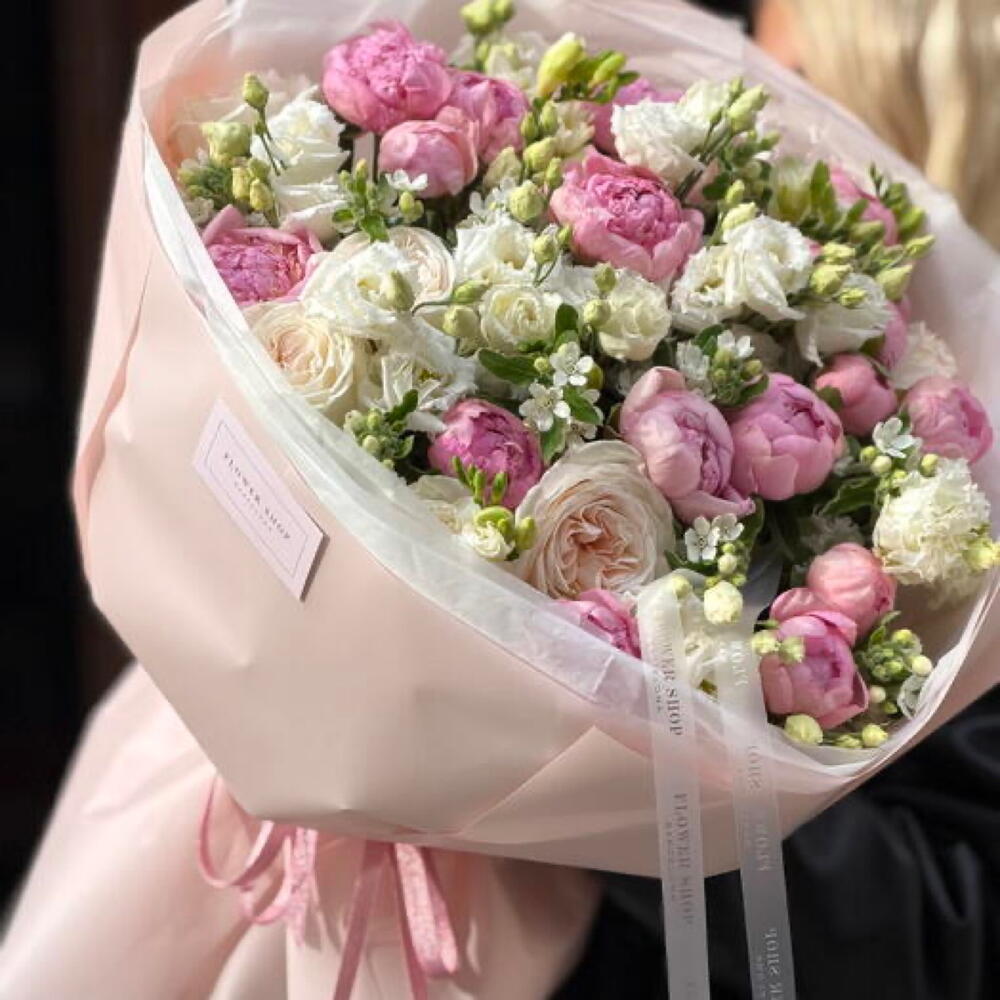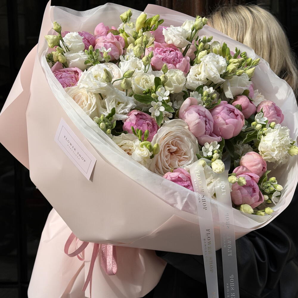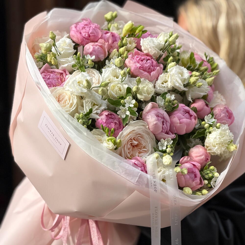 Freesia - 7 ud. Peonias - 20 ud. Lisianthus - 10 ud. ohara rose - 7 ud. óxipetalum - 10 ud.