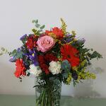 tallos de solidago - 2 ud. tallos de alstroemerias rojas - 4 ud. tallos de Gerbera rojas - 4 ud. tallos de rosas rosas - 2 ud. tallso de caleveles blancos - 4 ud. tallos de iris violeta - 4 ud.