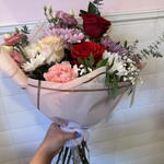 Lisianthus - 2 ud. rosas - 3 ud. paniculata - 2 ud. claveles - 4 ud. crisantemos - 2 ud. verdes varios - 4 ud. papel coreano - 2 ud. elementos decorativos - 2 ud. margaritas multiflor - 3 ud.