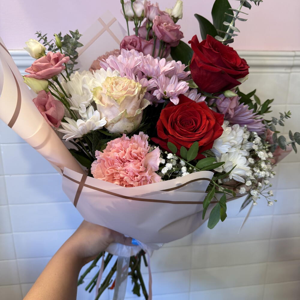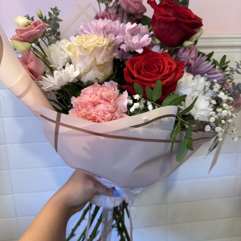 Lisianthus - 2 ud. rosas - 3 ud. paniculata - 2 ud. claveles - 4 ud. crisantemos - 2 ud. verdes varios - 4 ud. papel coreano - 2 ud. elementos decorativos - 2 ud. margaritas multiflor - 3 ud.