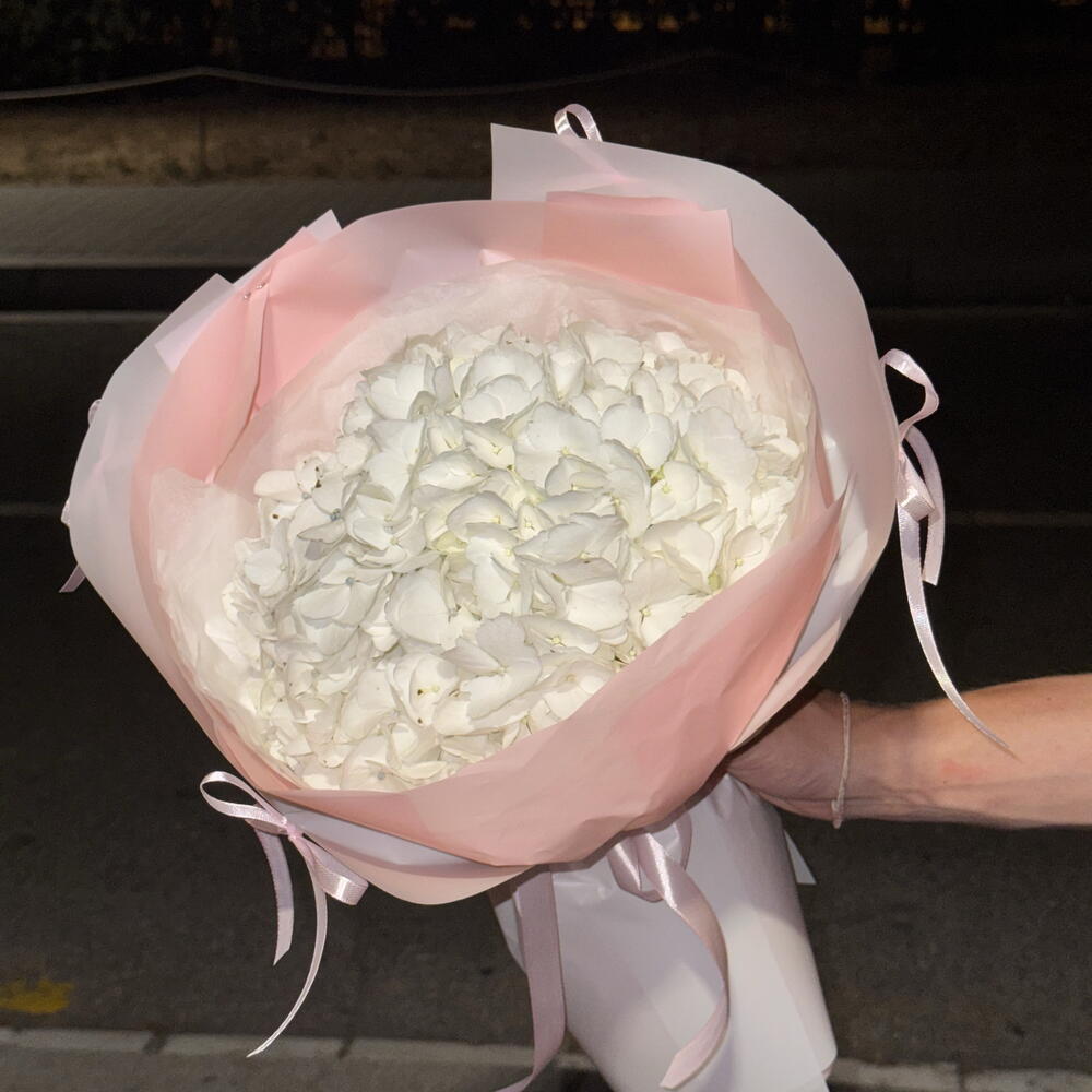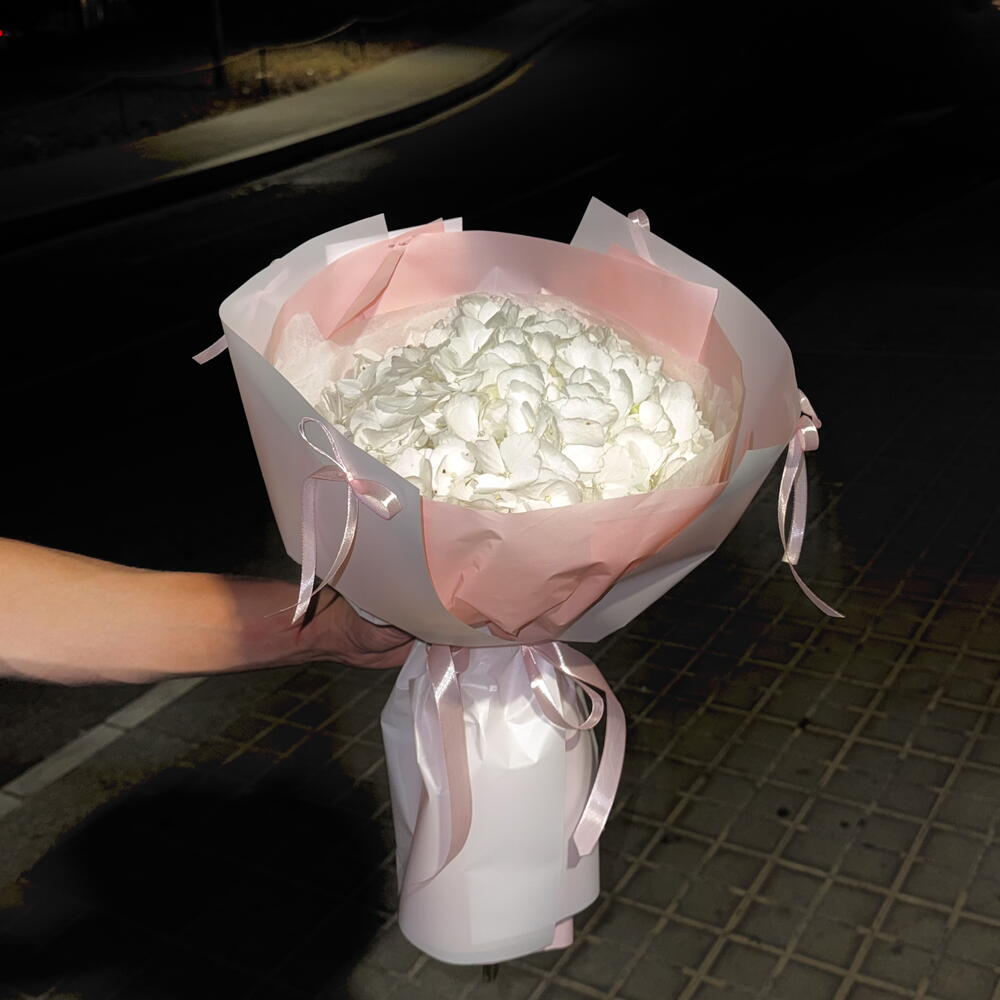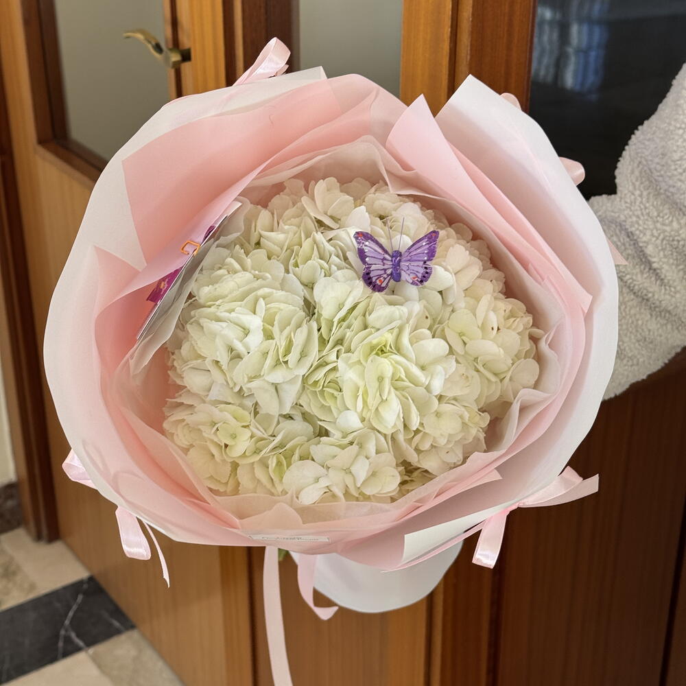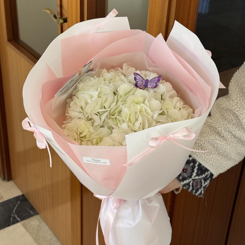 Un ramo de hortensias blancas, que parece una pequeña nube. Regalo perfecto para presupuestos ajustados. En Elysia flowers buscamos cuidarte y proporcionarte el mejor servicio. Todos nuestros ramos incluyen una guía de cuidados en casa, alimento para flores y la posibilidad de personalización. Esperamos que tu experiencia vaya sin problemas y recibas el mejor producto posible.