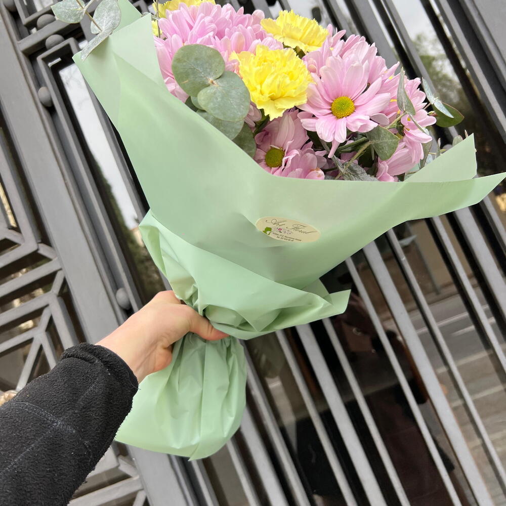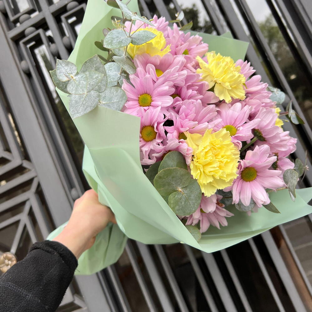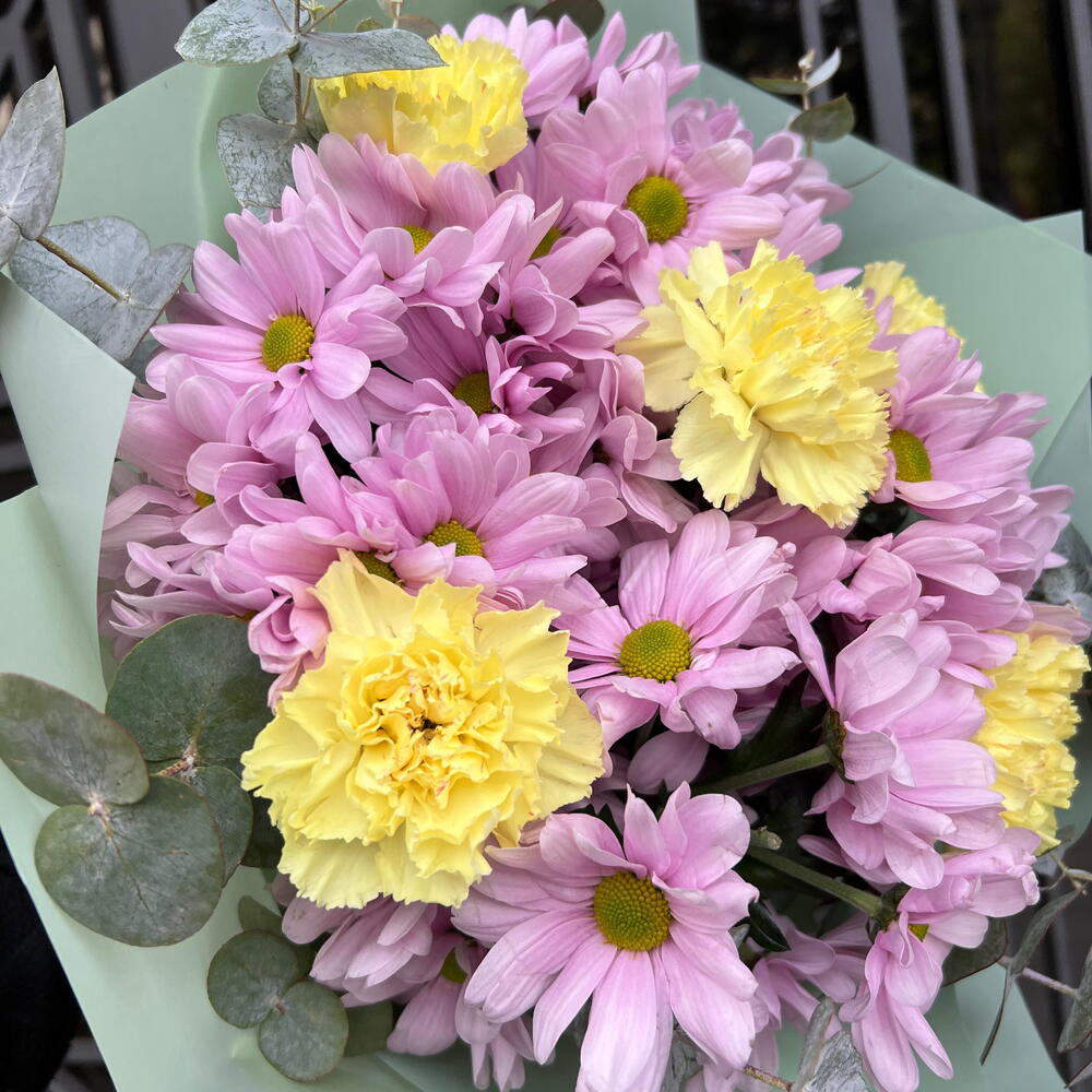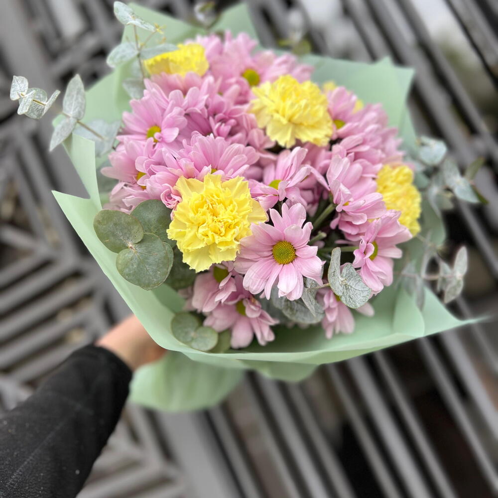 Ramo alegre en tonos pastel con margaritas rosadas, flores amarillas y eucalipto. Ideal para cumpleaños, agradecimientos, nacimientos o simplemente para regalar una sonrisa y llenar el día de color.