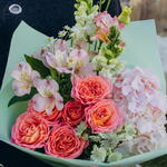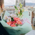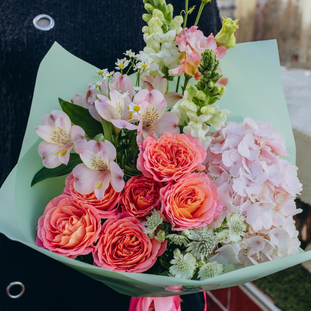 Spray rose - 2 ud. Hydrangea - 1 ud. Alstroemeria - 2 ud. Lisianthus - 1 ud. greens decorative - 2 ud. antirrinum - 2 ud. tanacetum spray daisy - 1 ud.