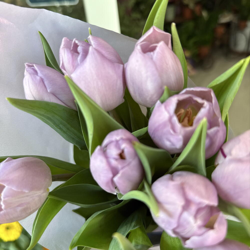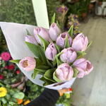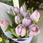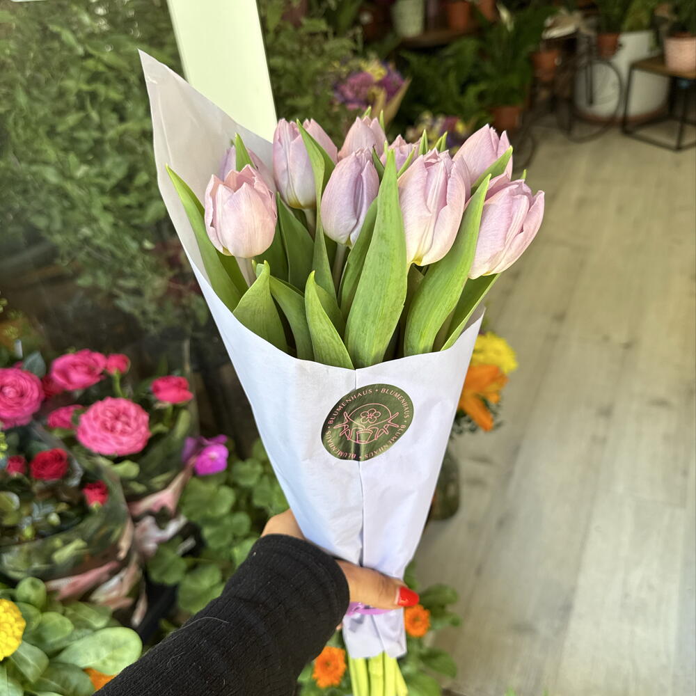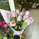 Pomo de tulipanes juvenil y fresco acompañado de un envoltorio pensado para realzar la belleza natural de las flores