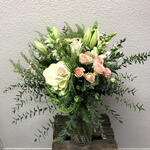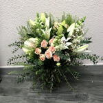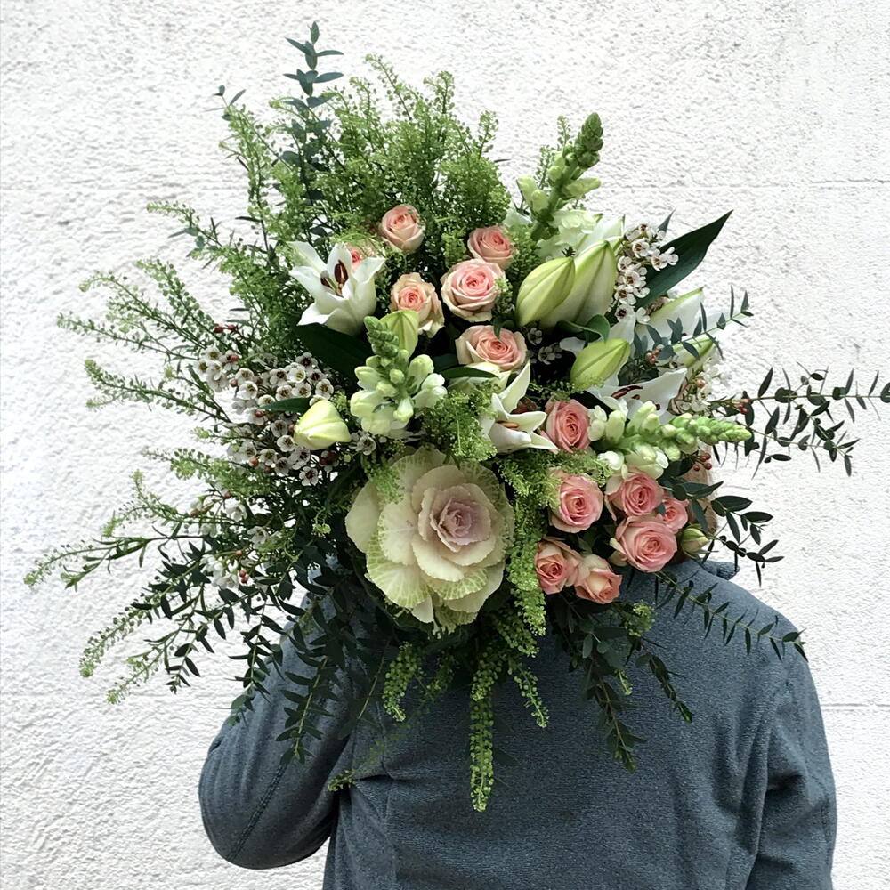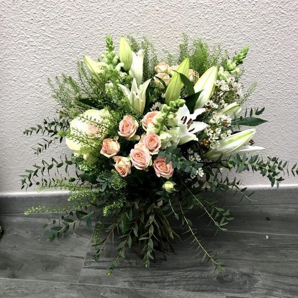 eucalipto - 6 ud. rosas - 8 ud. verdes variados - 3 ud. lilium blanco - 4 ud. boca de dragón blanca - 4 ud. Wax flower blanco - 3 ud. col ornamental blanca - 1 ud.