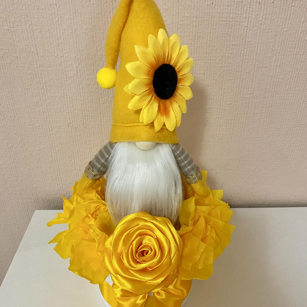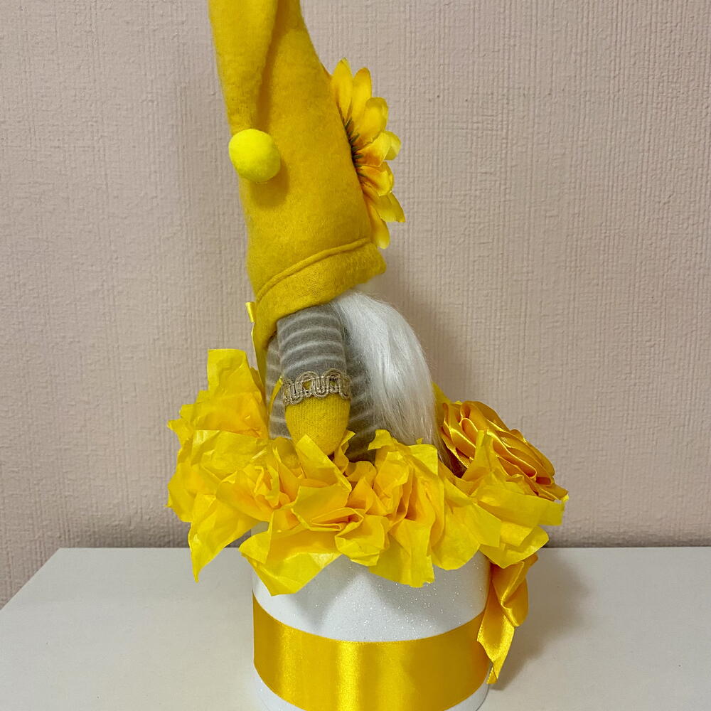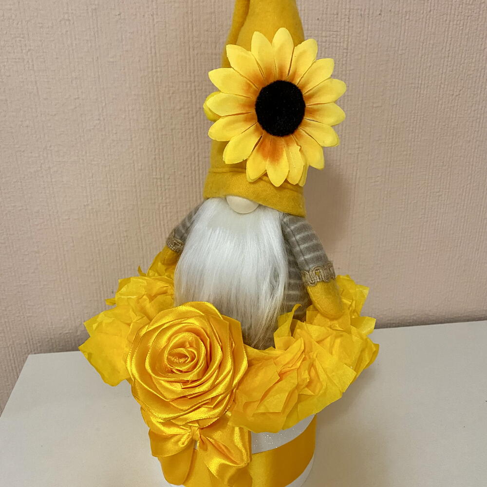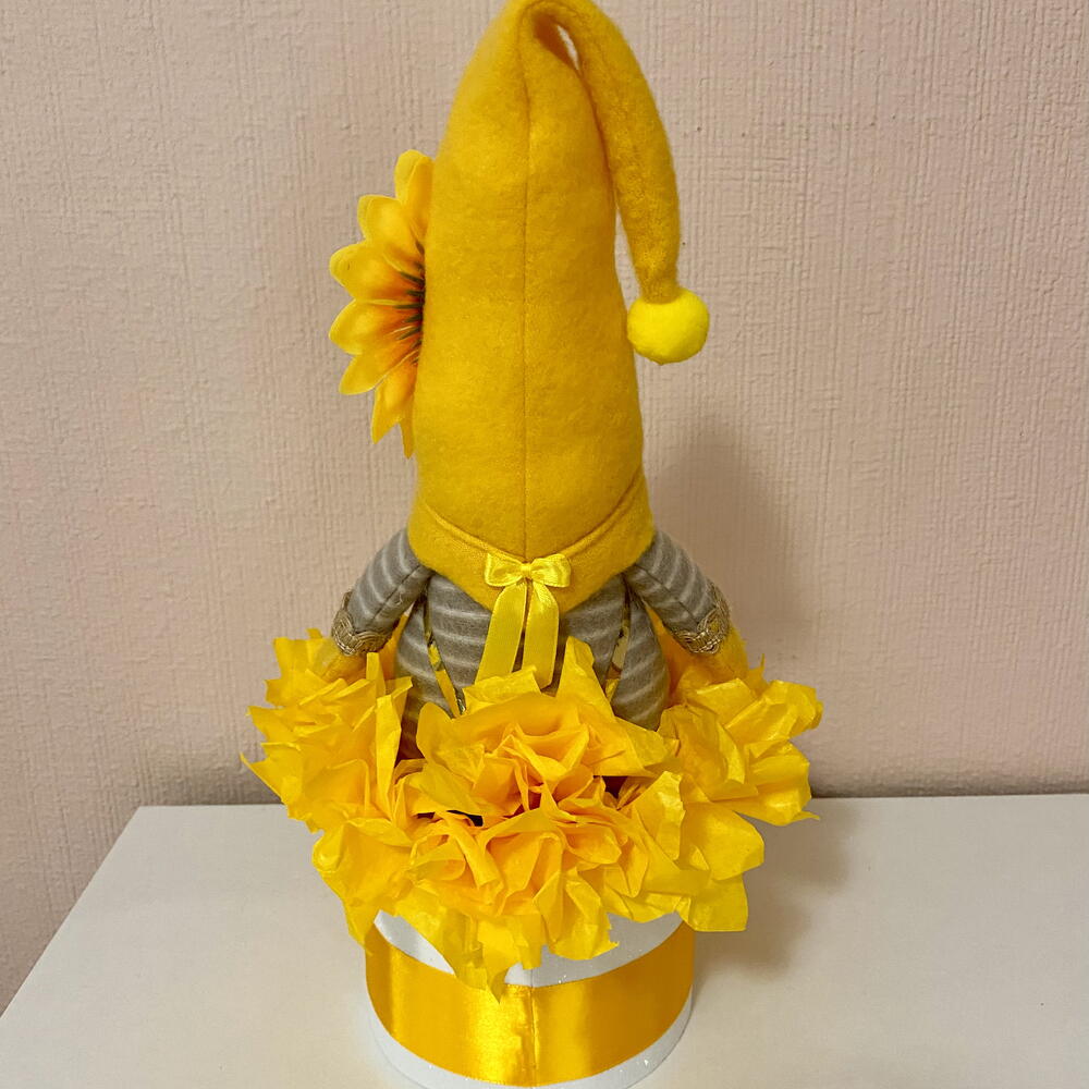 🌻 La primera sonrisa de la primavera. En muchos lugares, la llegada de la primavera se celebra con flores amarillas, símbolos de sol, alegría y nuevos comienzos. Esta especial caja de regalo con gnomo de girasol transmite precisamente ese espíritu alegre: un pequeño símbolo de felicidad, calidez y esperanza. En el centro de la caja se encuentra un gnomo de girasol hecho a mano, creado completamente desde cero. Cada detalle – desde la suave barba hasta el girasol del gorro – está elaborado cuidadosamente a mano, lo que hace que cada pieza sea realmente única. Los tonos amarillos brillantes, la rosa de satén hecha a mano y la alegre composición reflejan la hermosa energía de la primavera: - felicidad - sol - nuevos comienzos Un regalo perfecto para - celebrar la primavera - un cumpleaños - simplemente para llevar un poco de luz y energía positiva al día de alguien. Un regalo decorativo especial.