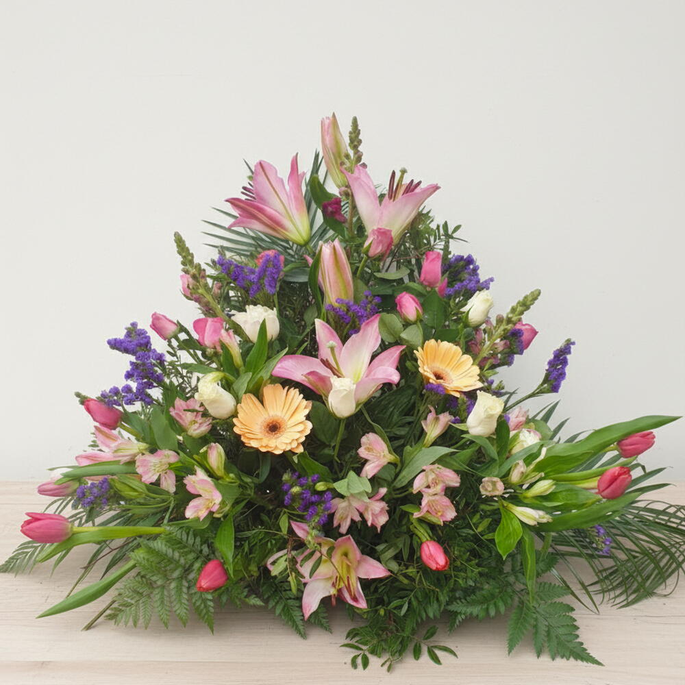 Este colorido arreglo floral es un homenaje a la frescura y la alegría de la primavera. Los lirios rosados se abren con elegancia, mientras las gerberas amarillas aportan un toque radiante y cálido. Los tulipanes y las alstroemerias en tonos suaves transmiten ternura y romanticismo, en contraste con las flores lilas que brindan profundidad y vitalidad. El follaje verde complementa la composición, dándole un aire natural y armonioso. Es el detalle perfecto para cumpleaños, aniversarios o para alegrar cualquier espacio con un soplo de frescura. Cada flor ha sido seleccionada con cuidado para transmitir emociones y llenar de vida cada ocasión.