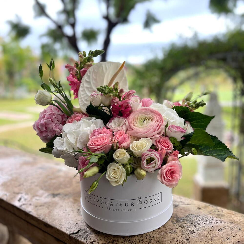 Lisianthus - 5 ud. ranúnculos - 1 ud. anthirinum - 4 ud. anthurium blanco - 1 ud. hortensia blanca y rosa - 2 ud.