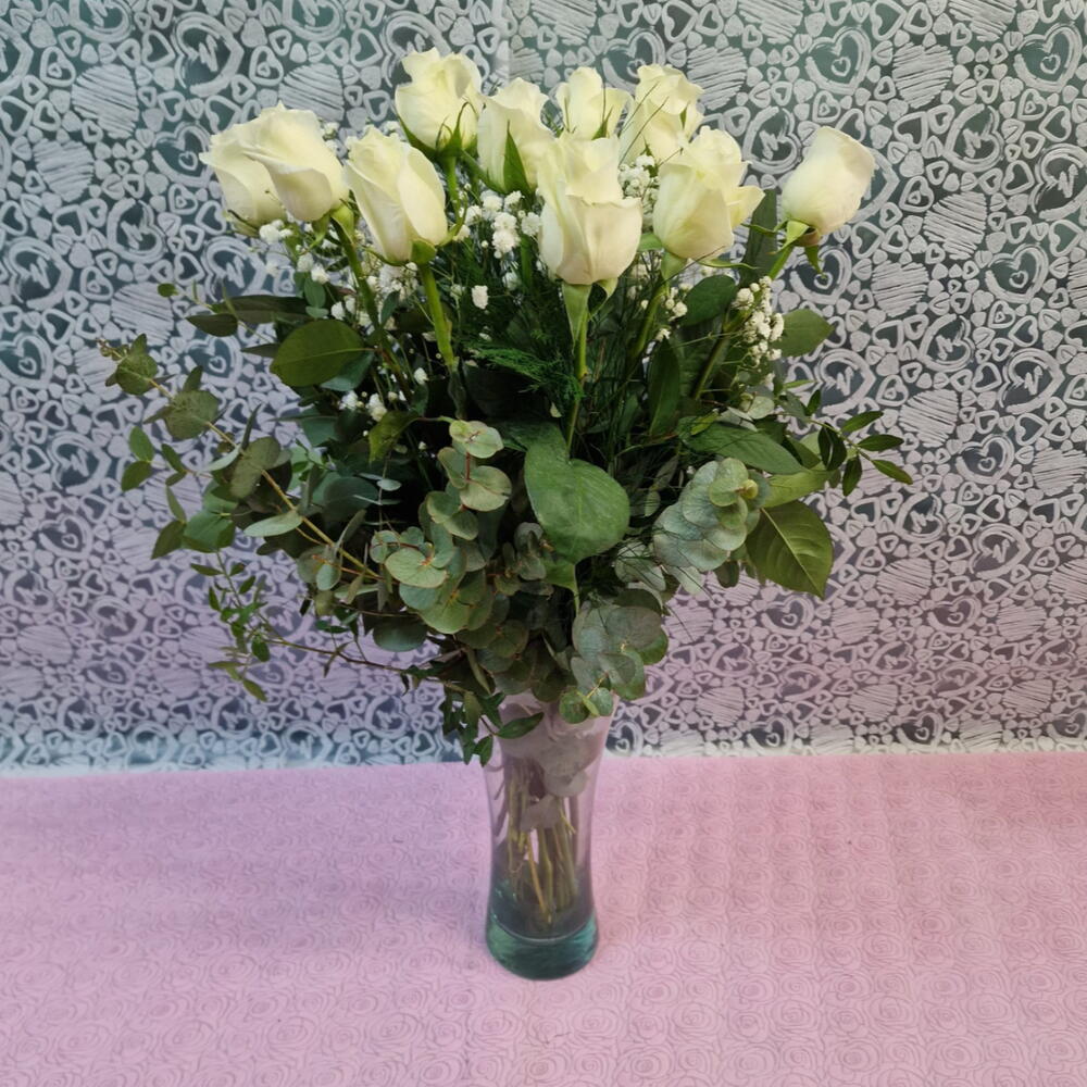 12 rosas blancas con elegante jarrón, perfecto para demostrar sentimiento de admiración y serenidad