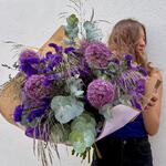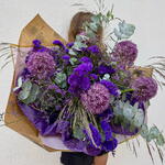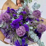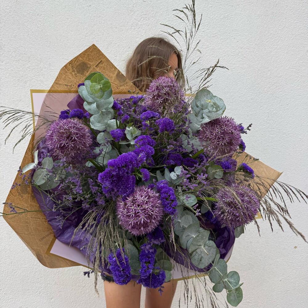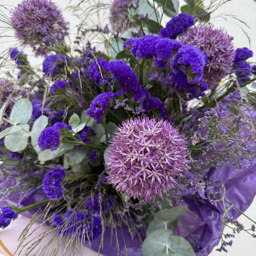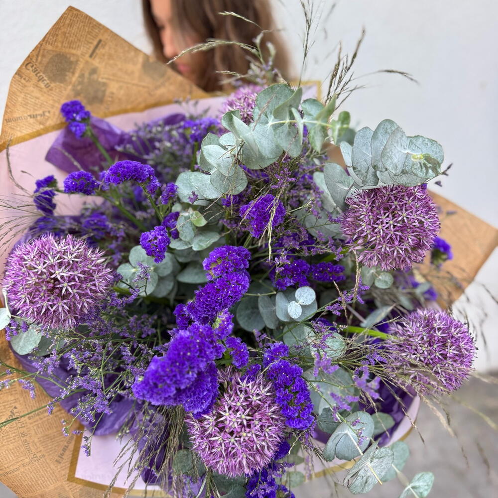 Statice - 10 ud. Eucalyptus - 5 ud. Limonium - 10 ud. craft paper - 1 ud. allium - 5 ud. greenery mix - 1 ud.