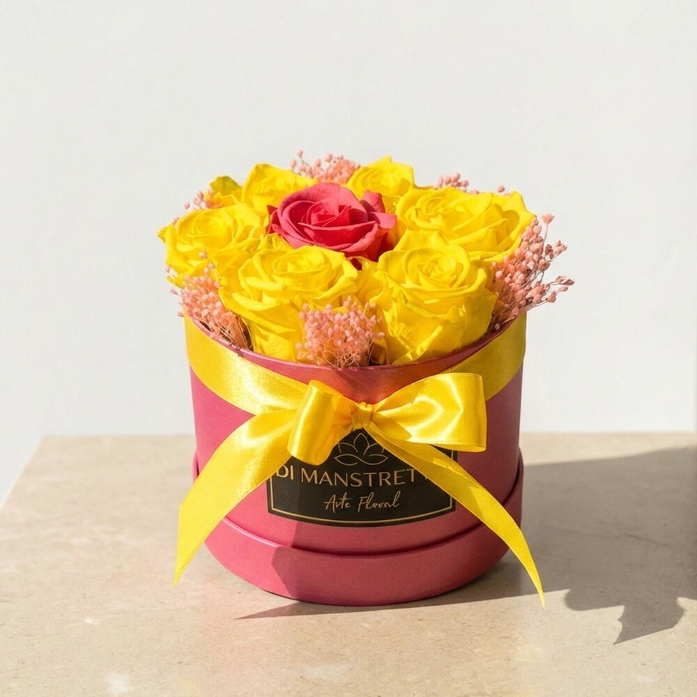 Una explosión de luz y alegría en forma de flores. Raggio di Sole captura la calidez del sol en un elegante diseño floral, combinando siete rosas amarillas preservadas con una rosa rosada central, rodeadas de delicada paniculata rosa. Este arreglo irradia felicidad y energía positiva, ideal para regalar buenos deseos, iluminar espacios o celebrar momentos únicos con estilo y color. Cuidados recomendados: Mantén el arreglo lejos de la luz solar directa y de fuentes de humedad para conservar los colores vivos. Límpialo suavemente con aire frío o un pincel seco para quitar el polvo. No es necesario regar, ya que las flores están tratadas para durar años con su belleza intacta.