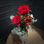 Ramito de dos rosas naturales prepradas con Hypericum y verdes variados. El ramito se presenta envuelto para regalo.