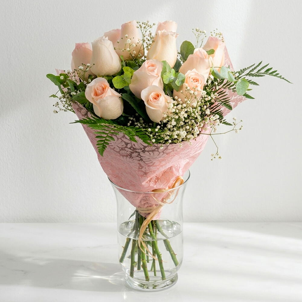 Este hermoso arreglo de Ramos clásicos está compuesto por 12 delicadas rosas rosas, 3 Paniculata y 3 ramas de helecho de cuero, que le dan un toque de elegancia y sofisticación. Es perfecto para celebrar cualquier ocasión especial, o simplemente para alegrar su hogar con su belleza natural.