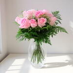 Este espléndido ramo clásico está compuesto por 12 maravillosas rosas rosadas que capturan la verdadera esencia del romance y la alegría. La composición se completa con rellenos y toques verdes para proporcionar un hermoso contraste que realza la belleza natural de las rosas. Este es el regalo perfecto para expresar tus sentimientos más profundos.