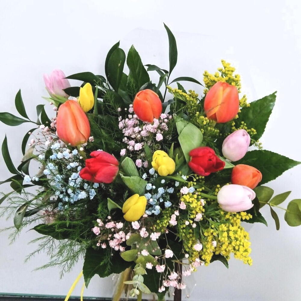 Gypsophila - 6 ud. tulipanes - 12 ud. eucalipto - 2 ud. mimosa - 2 ud. verdes variados - 6 ud.