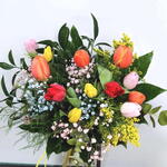 Este hermoso ramo de tulipanes multicolor irradia frescura, alegría y encanto primaveral. Cada flor aporta un toque vibrante que transmite energía positiva y una sensación de celebración. El arreglo está complementado con una delicada mezcla de verdes y florecillas que realzan la textura y profundidad del bouquet. Ideal para sorprender en momentos especiales o simplemente para iluminar el día de alguien querido. Para mantener su belleza por más tiempo, coloca los tallos en agua fresca, cambia el agua a diario y recorta ligeramente las puntas cada dos días. Evita exponer el ramo directamente al sol o a corrientes de aire fuertes. Con los cuidados adecuados, este ramo conservará su frescura y color por varios días.