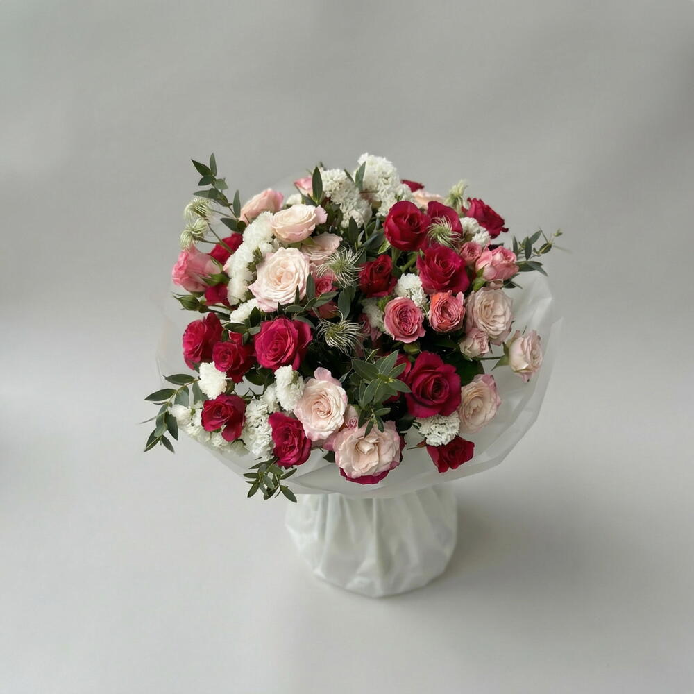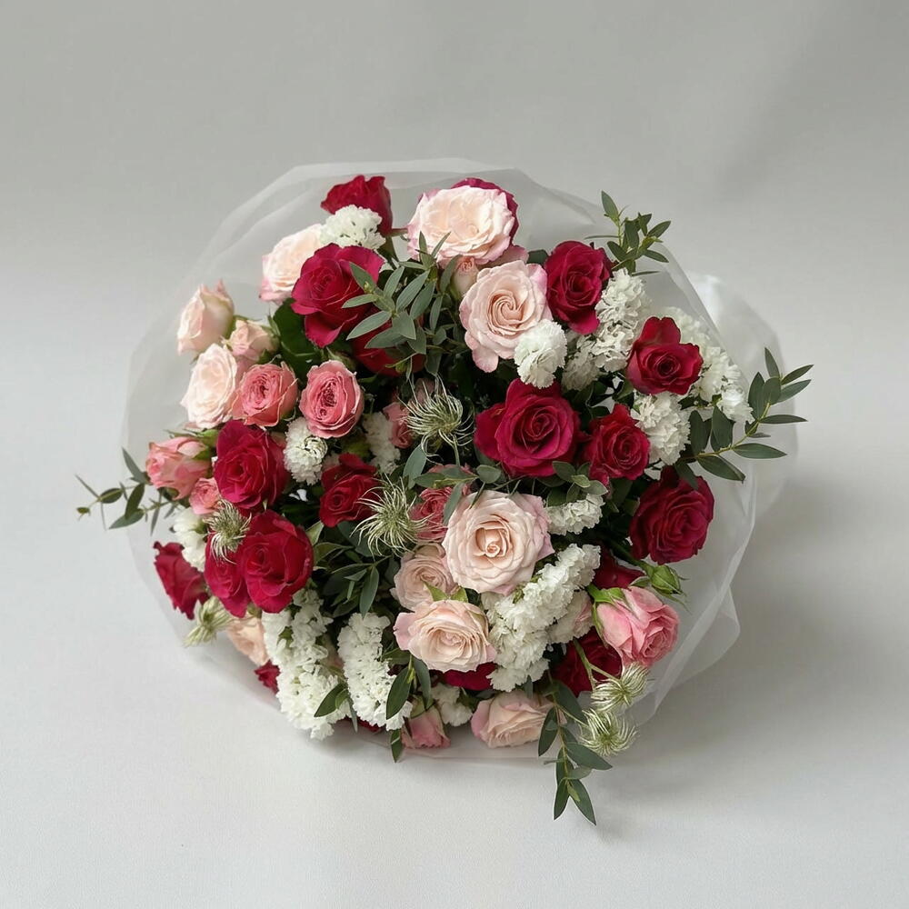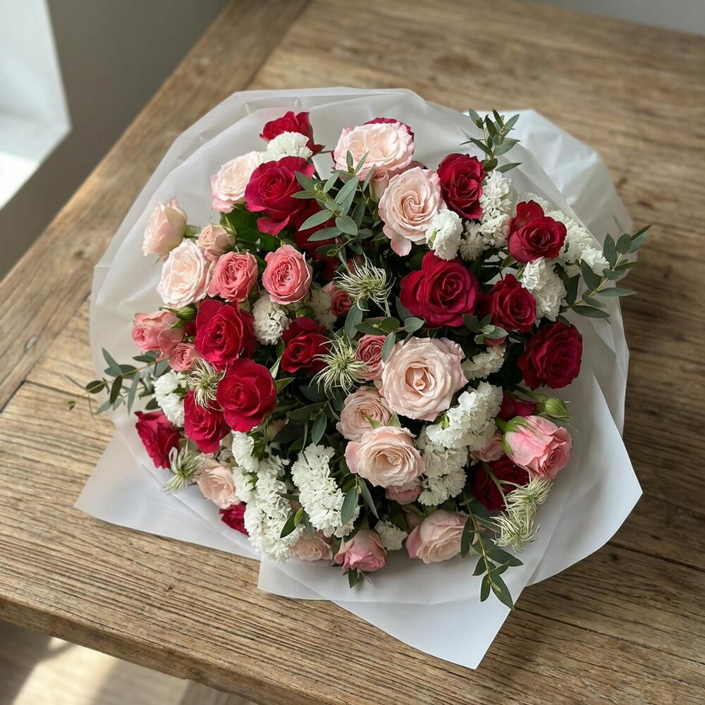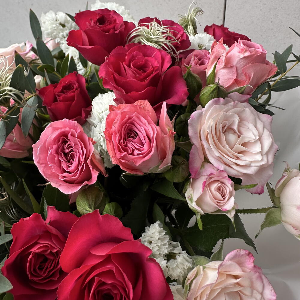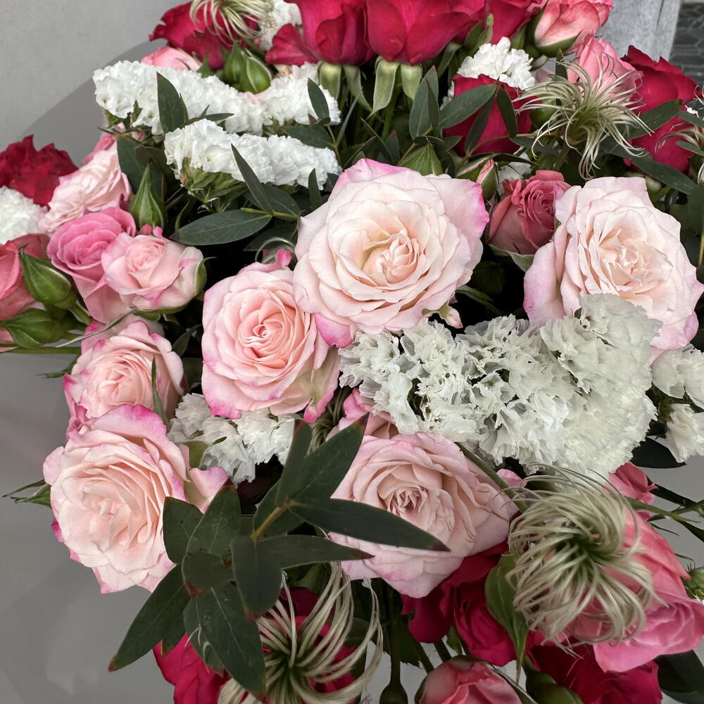 Un bouquet romántico y elegante, protagonizado por 15 rosas llenas de color y delicadeza. La statice añade un toque sutil y duradero, mientras que la clemátide aporta ligereza y movimiento al arreglo. La rama de eucalipto completa el conjunto con frescura y un aroma delicado.