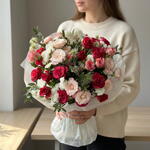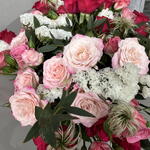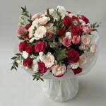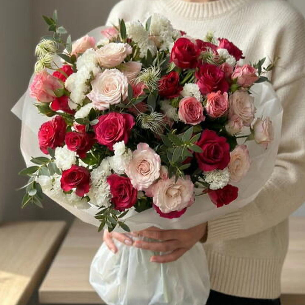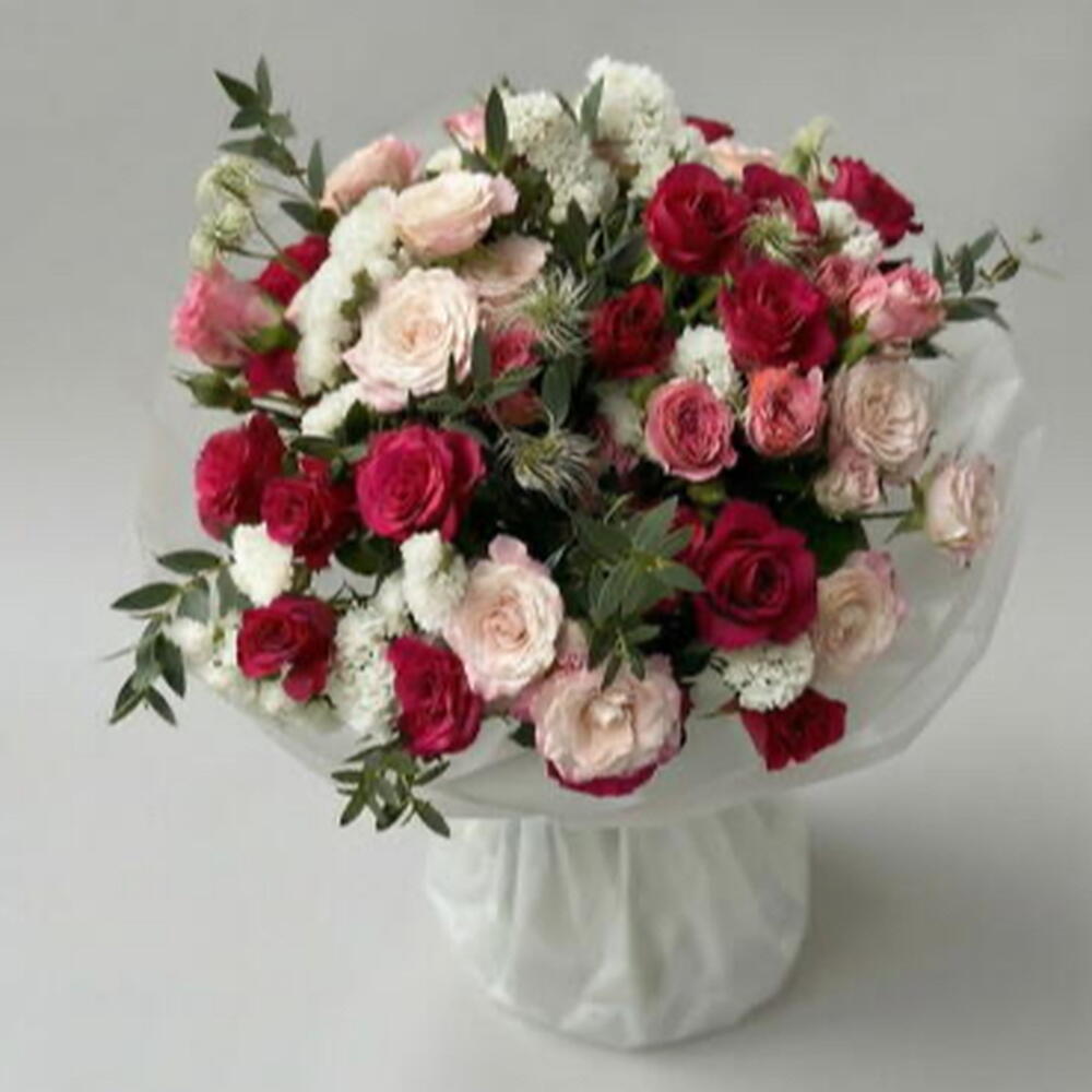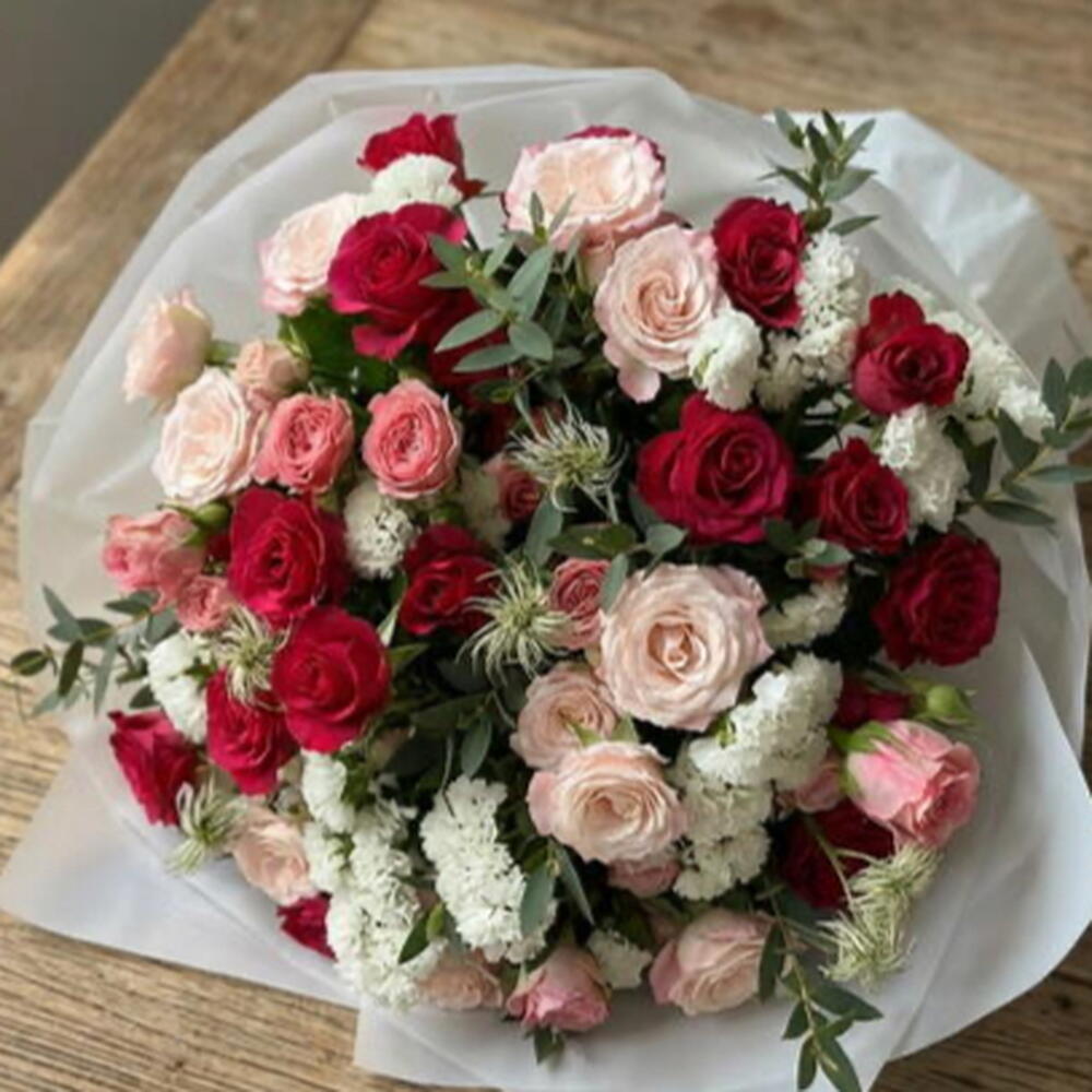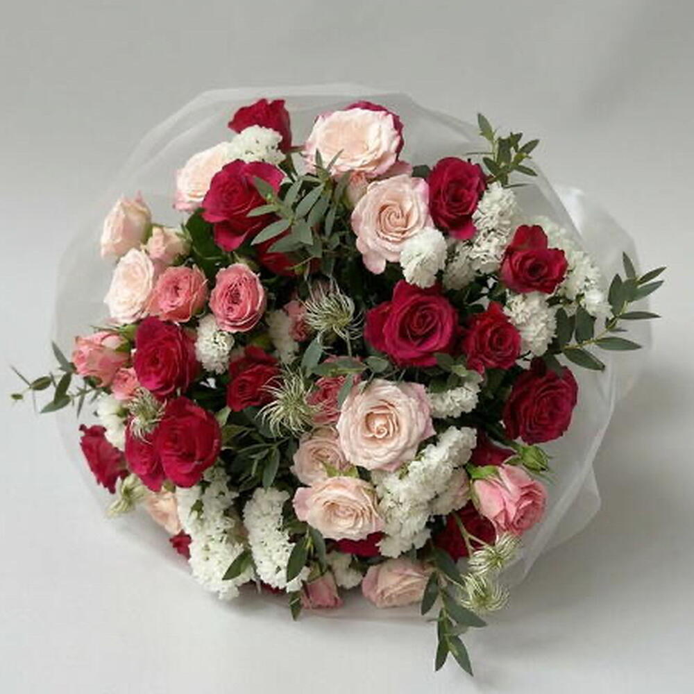 Un bouquet romántico y elegante, protagonizado por 15 rosas llenas de color y delicadeza. La statice añade un toque sutil y duradero, mientras que la clemátide aporta ligereza y movimiento al arreglo. La rama de eucalipto completa el conjunto con frescura y un aroma delicado.