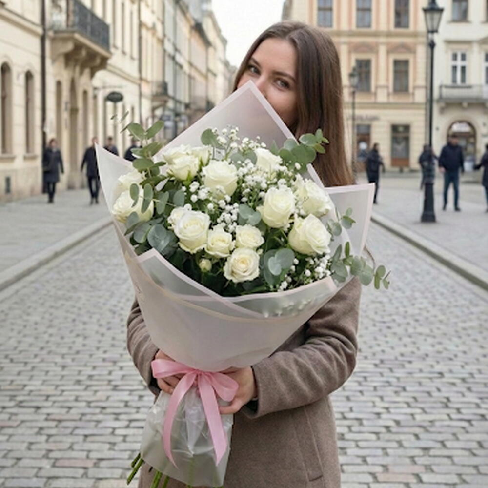 Ramo de 15 rosas blancas con paniculata y eucalipto – Envuelto en papel coreano Un clásico que nunca falla, pero con un toque moderno y delicado. Este ramo está compuesto por quince rosas blancas de tallo largo, símbolo de pureza, elegancia y nuevos comienzos, acompañadas de paniculata que aporta ligereza y romanticismo, y eucalipto fresco que añade textura, movimiento y un aroma suave y natural. El conjunto se presenta envuelto en papel coreano premium, con acabado elegante y minimalista, que realza la belleza de las flores y convierte el ramo en un regalo sofisticado desde el primer vistazo. Perfecto para cumpleaños, aniversarios, agradecimientos o simplemente para sorprender sin necesidad de una fecha especial. Un detalle delicado, luminoso y lleno de significado 🤍🌿