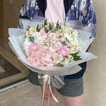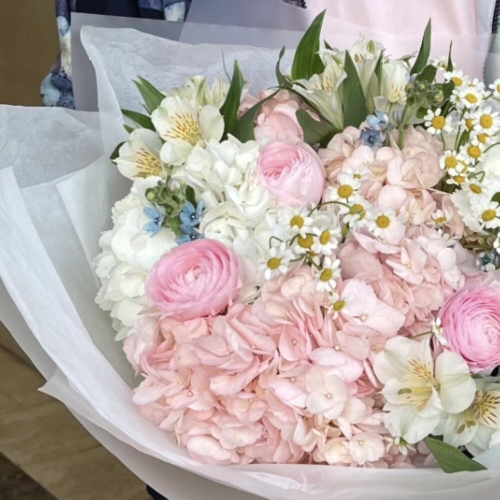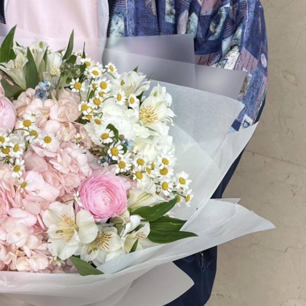Alstroemeria - 4 ud. ranunculus - 6 ud. oxipetalum - 4 ud. hortensia blanca - 5 ud. manzanilla - 3 ud.