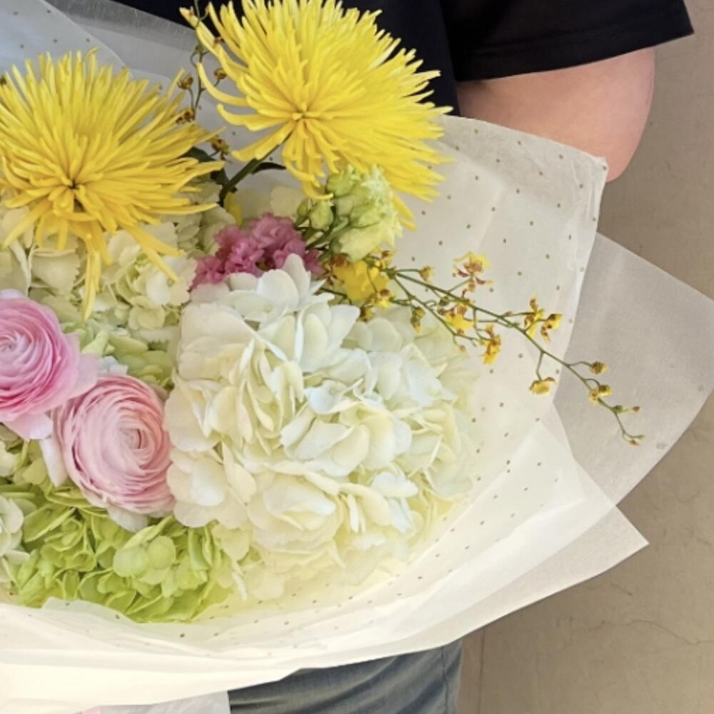 hortensia - 5 ud. Lisianthus - 2 ud. ranunculus - 3 ud. Wanda - 1 ud. crisantemos - 2 ud. oncidium - 2 ud.