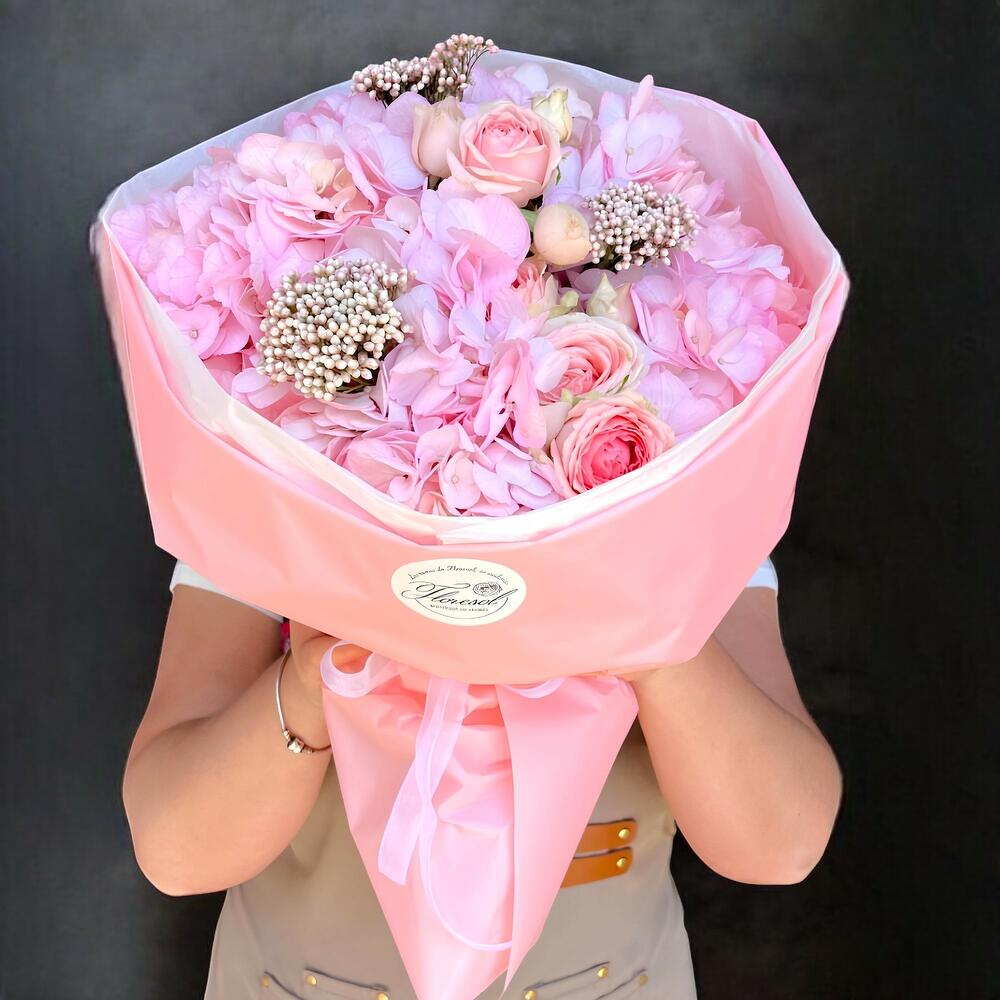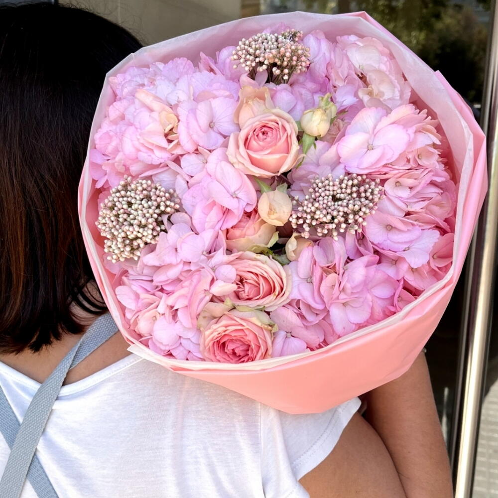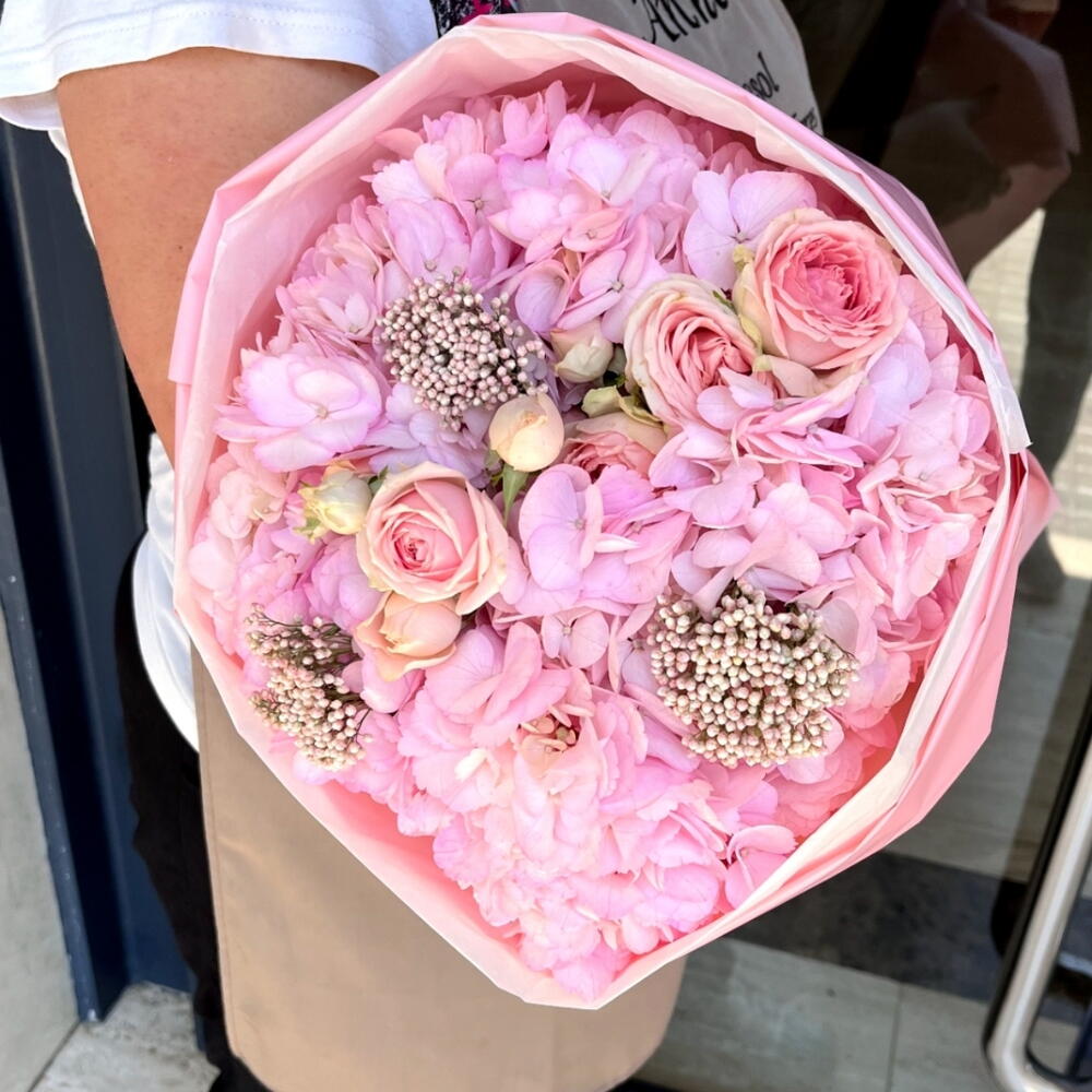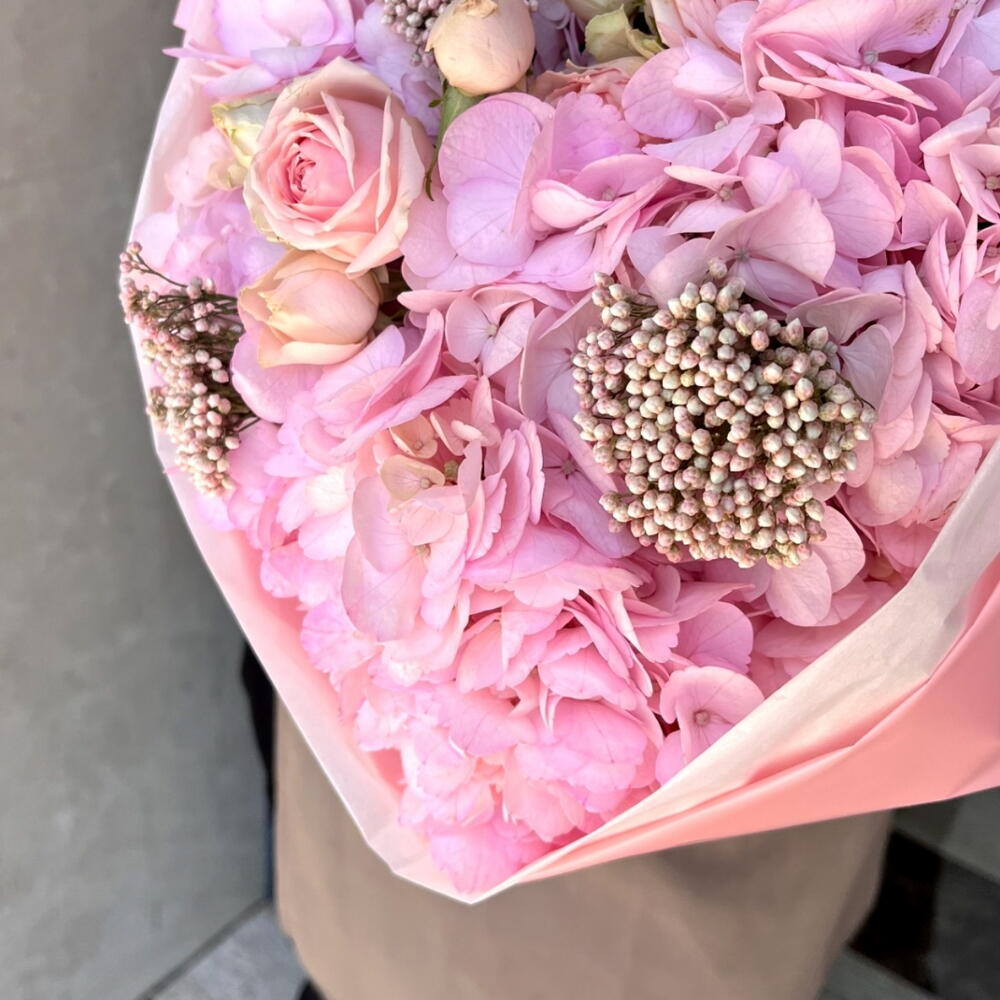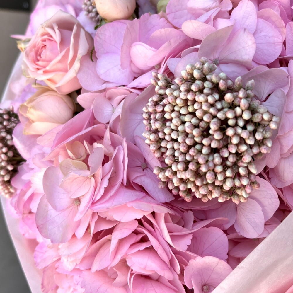 Un sofisticado bouquet en suaves tonos rosa que cautiva a primera vista por su elegancia y delicadeza. Las hortensias se combinan armoniosamente con rosas y detalles decorativos, creando una composición voluminosa y refinada. Cada elemento aporta una sensación de romanticismo y lujo discreto. El envoltorio rosa pastel realza la belleza del arreglo y le da un acabado moderno y delicado. Es perfecto para expresar amor, ternura y admiración en ocasiones especiales. Ideal para cumpleaños, aniversarios o regalos inolvidables. Un ramo que envuelve emociones dulces y deja una impresión duradera.