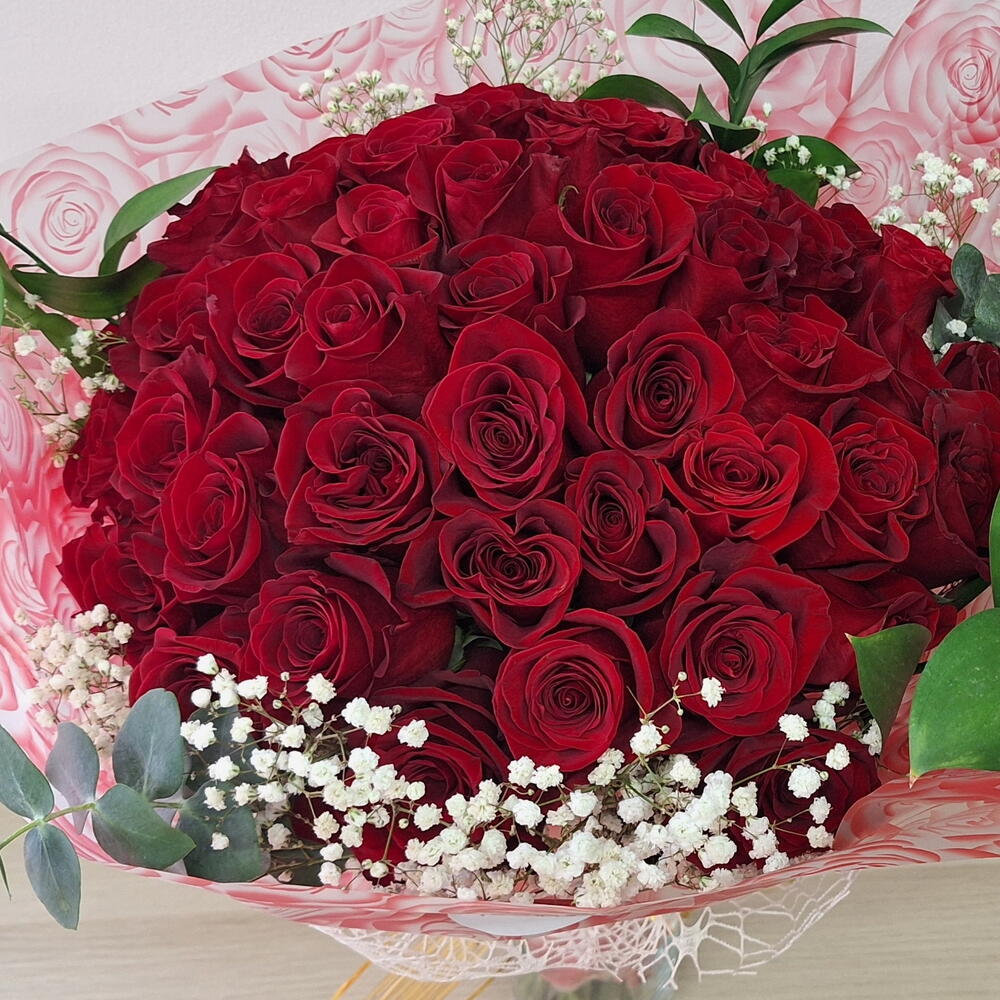 Ruscus - 4 ud. rosas rojas tallo largo - 50 ud. paniculata blanca - 6 ud. lazo de cinta - 1 ud. papel coreano - 6 ud.