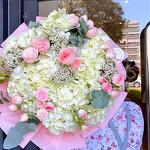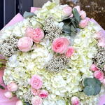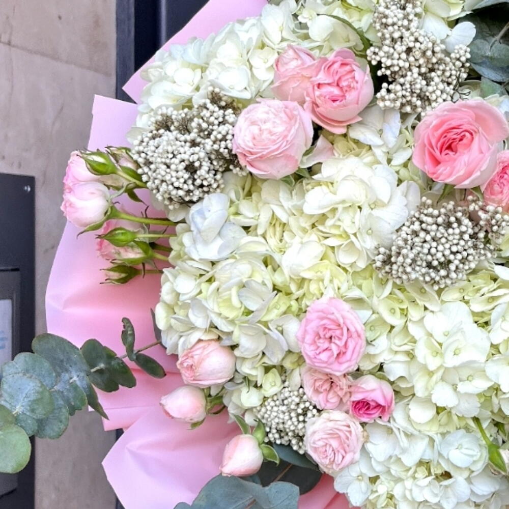 Este impresionante ramo combina la delicadeza de las hortensias blancas con la elegancia de las rosas y ranúnculos en tonos rosados. La gypsophila aporta un aire ligero y romántico, mientras que el eucalipto añade frescura y un toque natural. Perfecto para ocasiones especiales como bodas, aniversarios o para expresar amor y gratitud. Un arreglo floral que no pasará desapercibido.