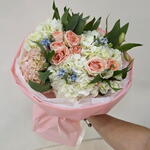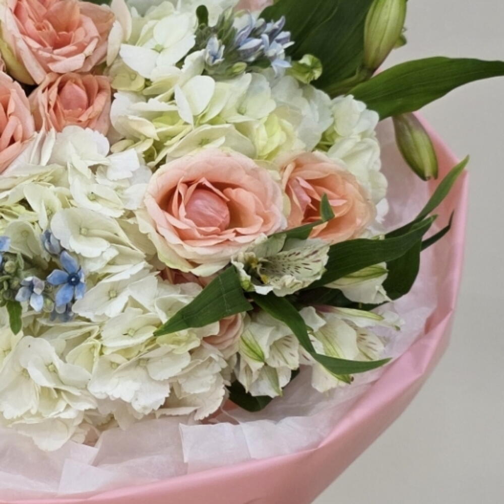 Alstroemeria - 5 ud. hortensia - 6 ud. rosas - 3 ud. oxipetalum - 3 ud.