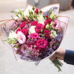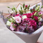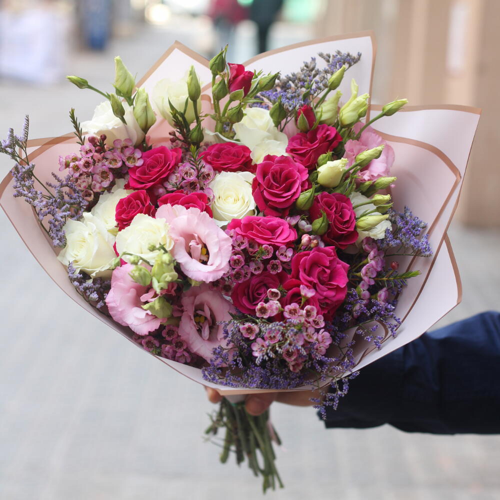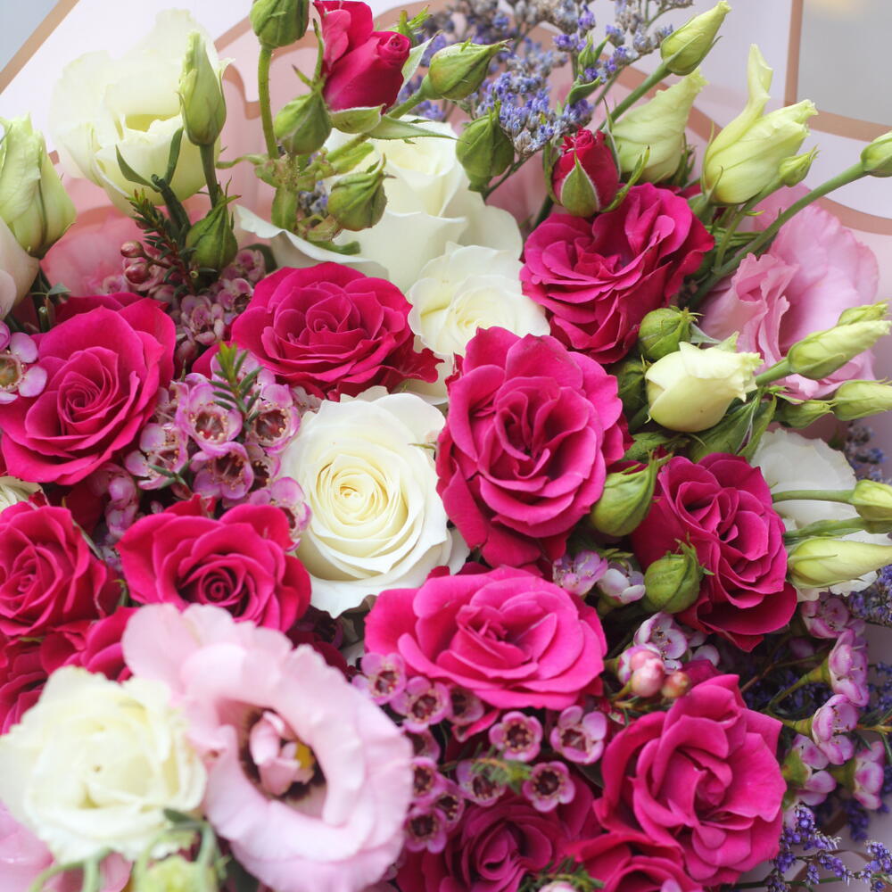 Limonium - 3 ud. Lisianthus - 2 ud. rosas blancas - 5 ud. rosas spray fucsia rosadas - 5 ud.