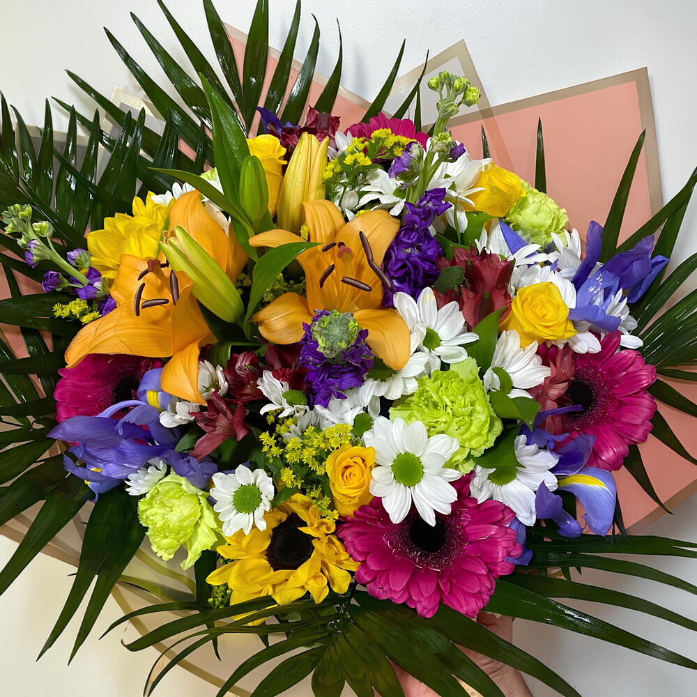 Alstroemeria - 3 ud. eucalipto - 3 ud. rosas - 3 ud. margarita - 6 ud. clavellina - 5 ud.