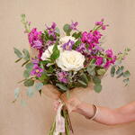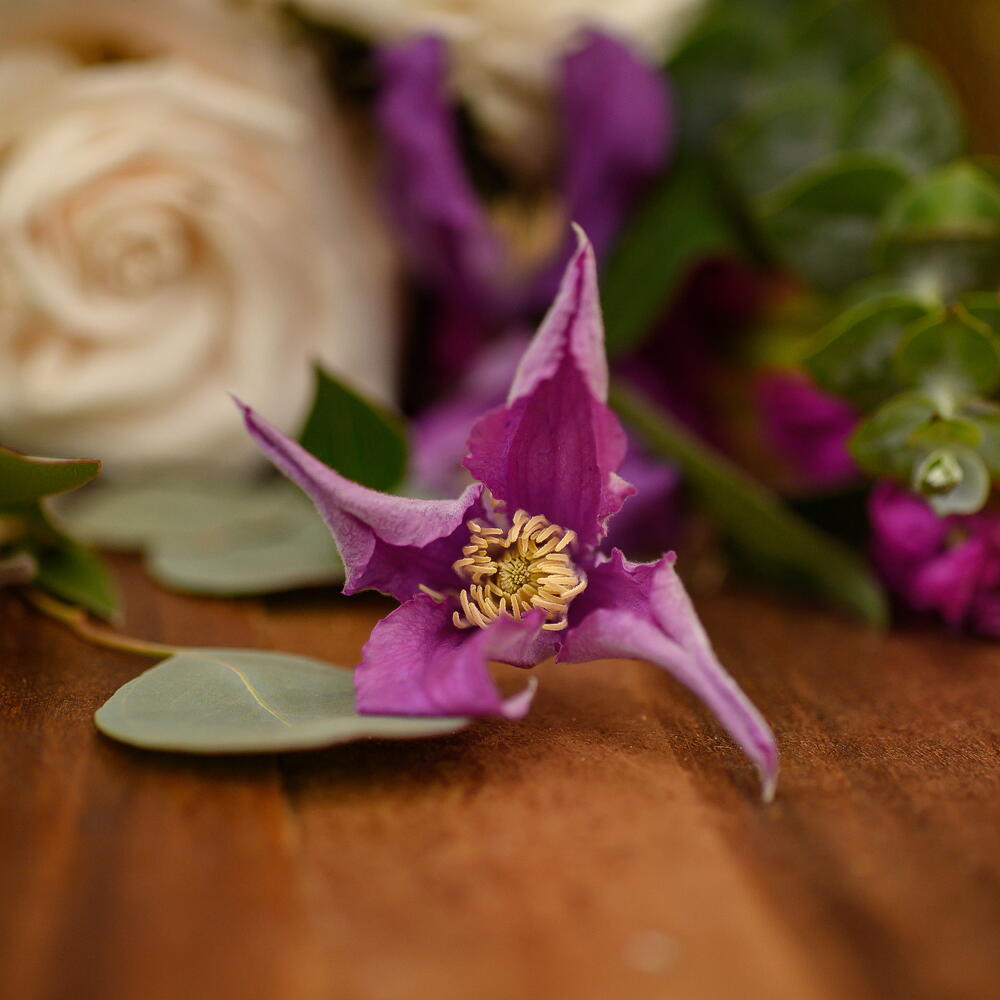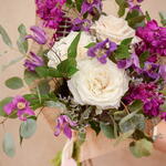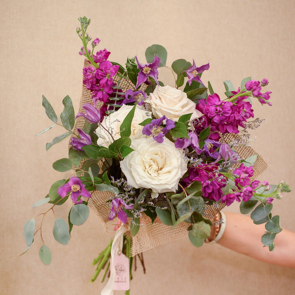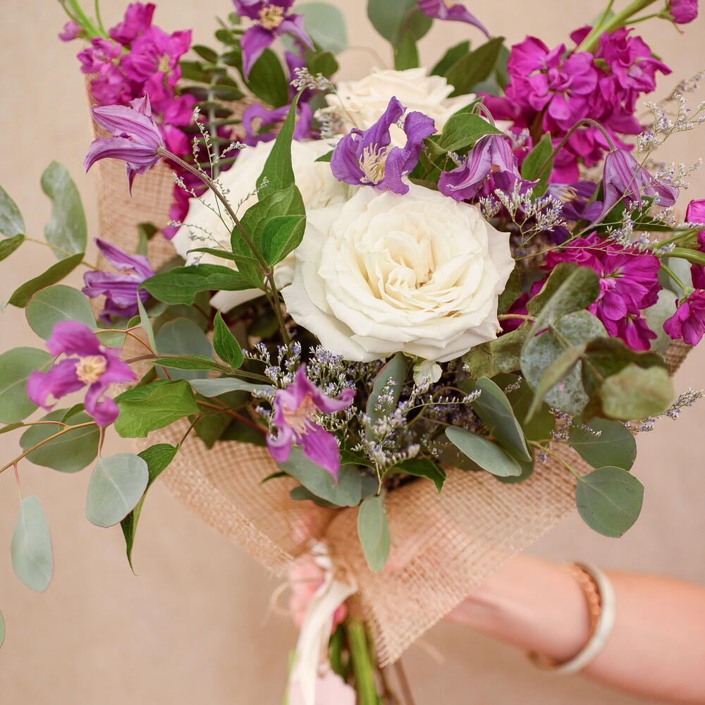 Clematis - 2 ud. eucalipto - 5 ud. rosas blancas - 3 ud. alheli - 3 ud. envoltorio de yute - 1 ud. etiqueta marcada a láser con mensaje personalizado - 1 ud.
