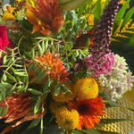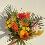 Este vibrante ramo ilumina cualquier espacio con su energía cálida y festiva. La combinación de tonos naranjas, amarillos y verdes crea un contraste vivo, realzado por una rosa roja intensa en el centro, que aporta un toque apasionado y elegante. Las texturas variadas —desde flores esponjosas hasta tallos estructurados— hacen que el arreglo se vea dinámico y lleno de movimiento. Es ideal para celebraciones alegres como cumpleaños, aniversarios, inauguraciones o para regalar un momento de luz y color a alguien especial. Para mantener su frescura, coloca el ramo en un lugar fresco, cambia el agua cada dos días y corta ligeramente los tallos en diagonal antes de ponerlos en el florero. Evita la luz solar directa para prolongar la vida de las flores.