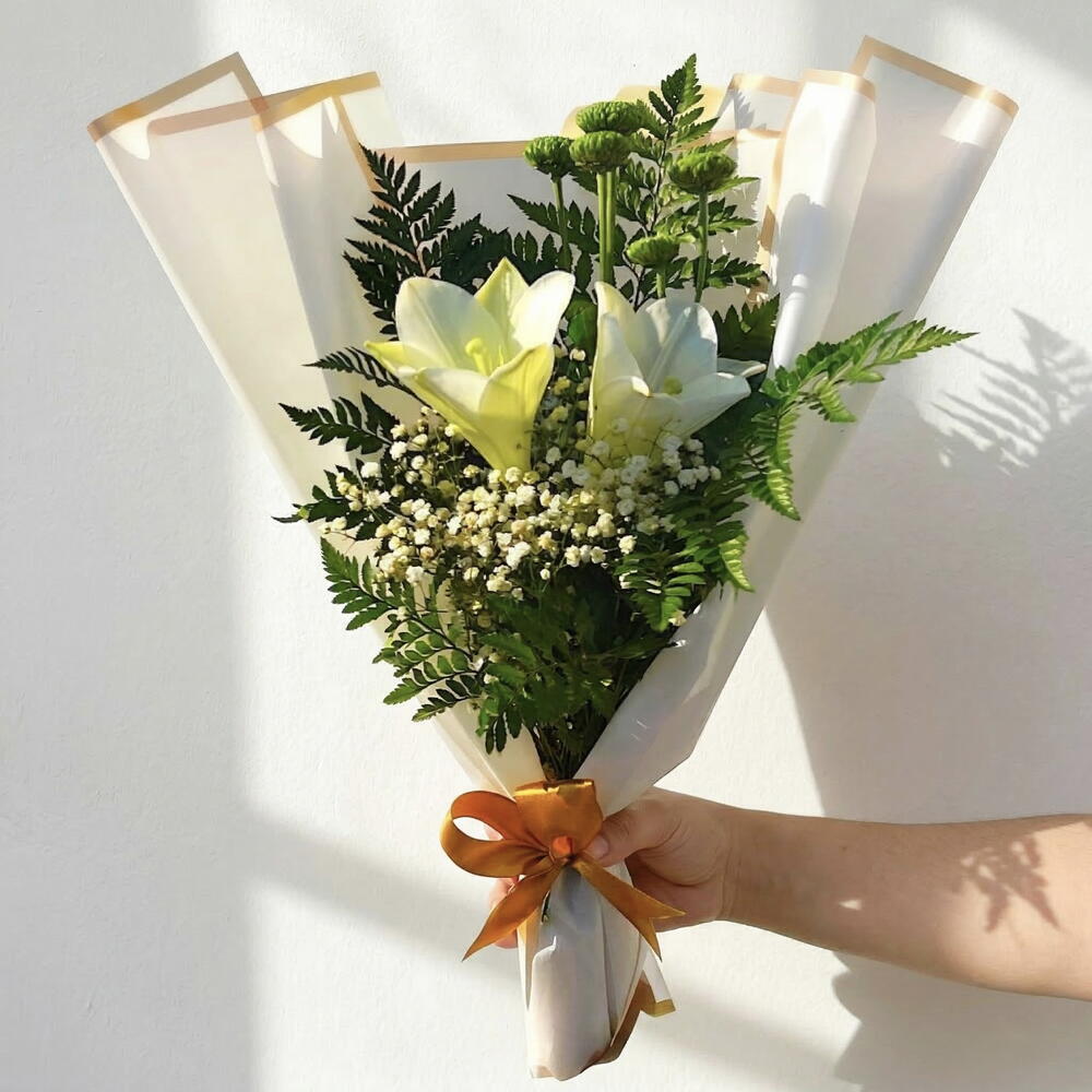 lilium blanco - 1 ud. margarita verde - 1 ud. helecho cuero - 2 ud.