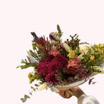 Solidago - 2 ud. eucalipto - 1 ud. claveles - 3 ud. antirino - 1 ud. crisantemos fucsia - 5 ud. ramaje salvaje - 1 ud.