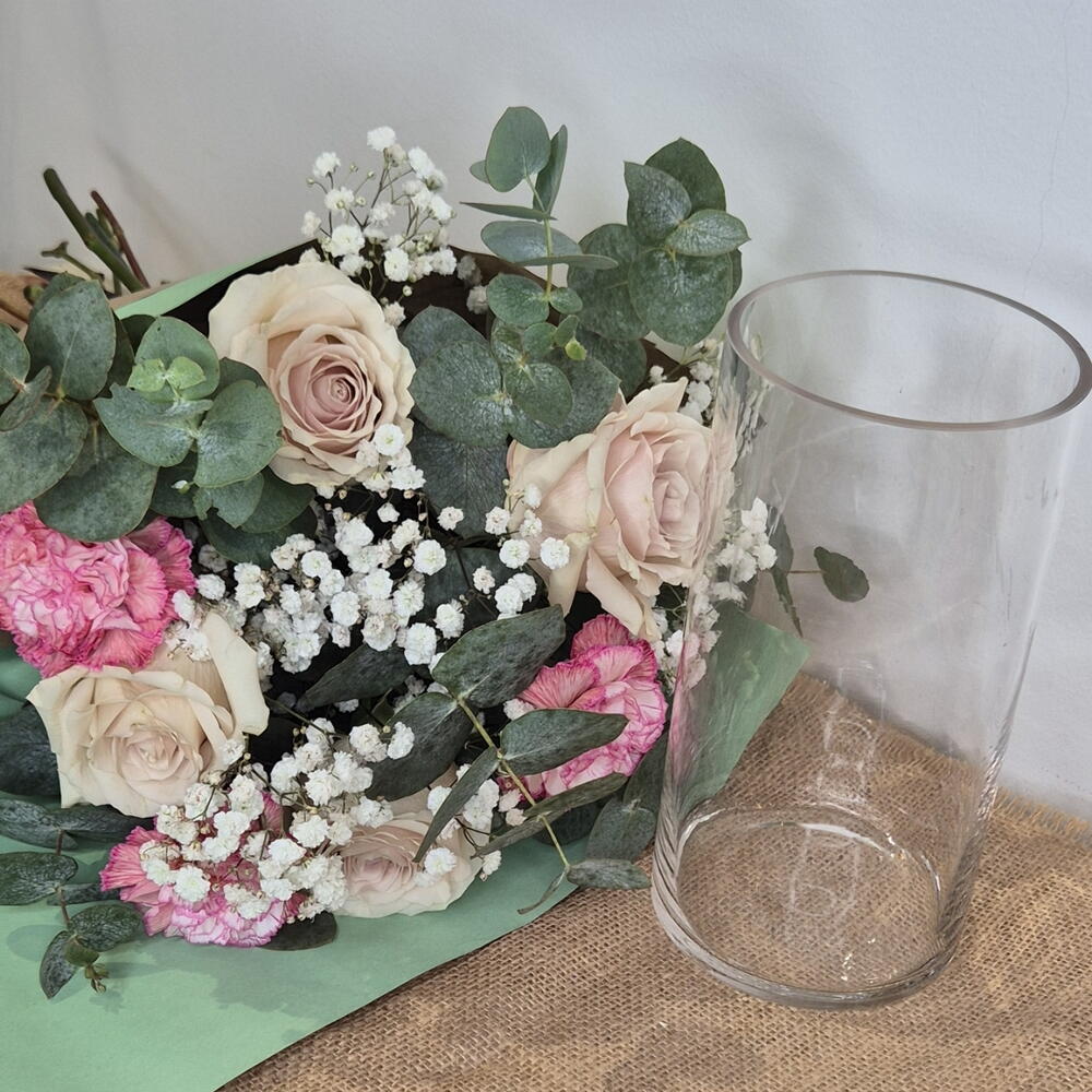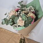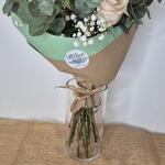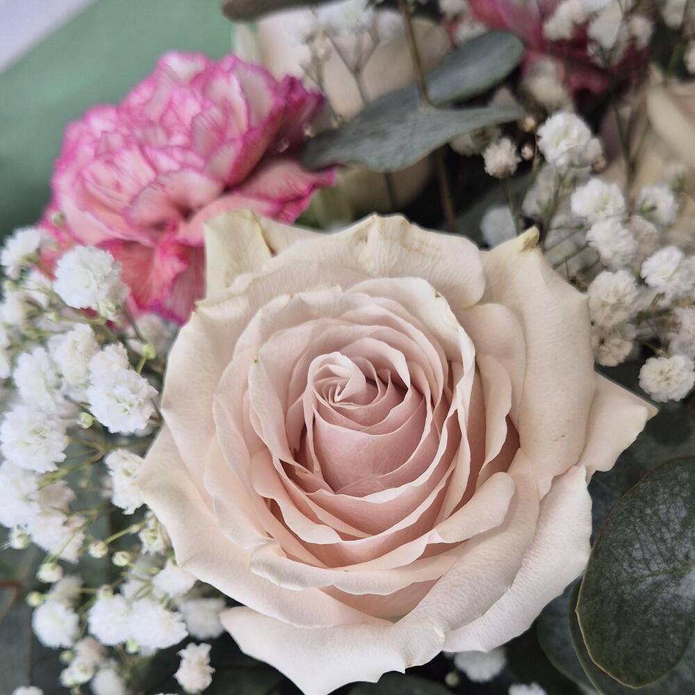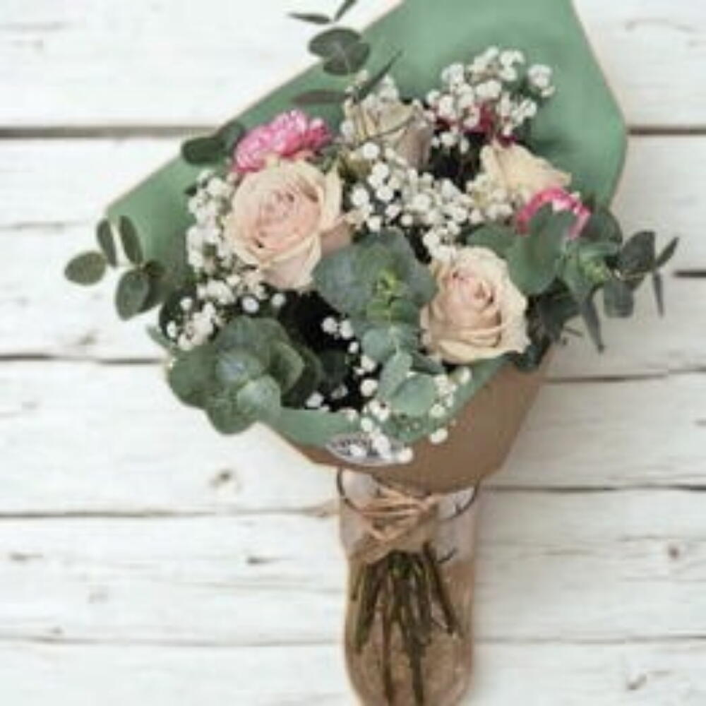 eucalipto cinerea - 6 ud. paniculata blanca - 3 ud. claveles rosados - 3 ud. rosas blanco rosa - 4 ud.