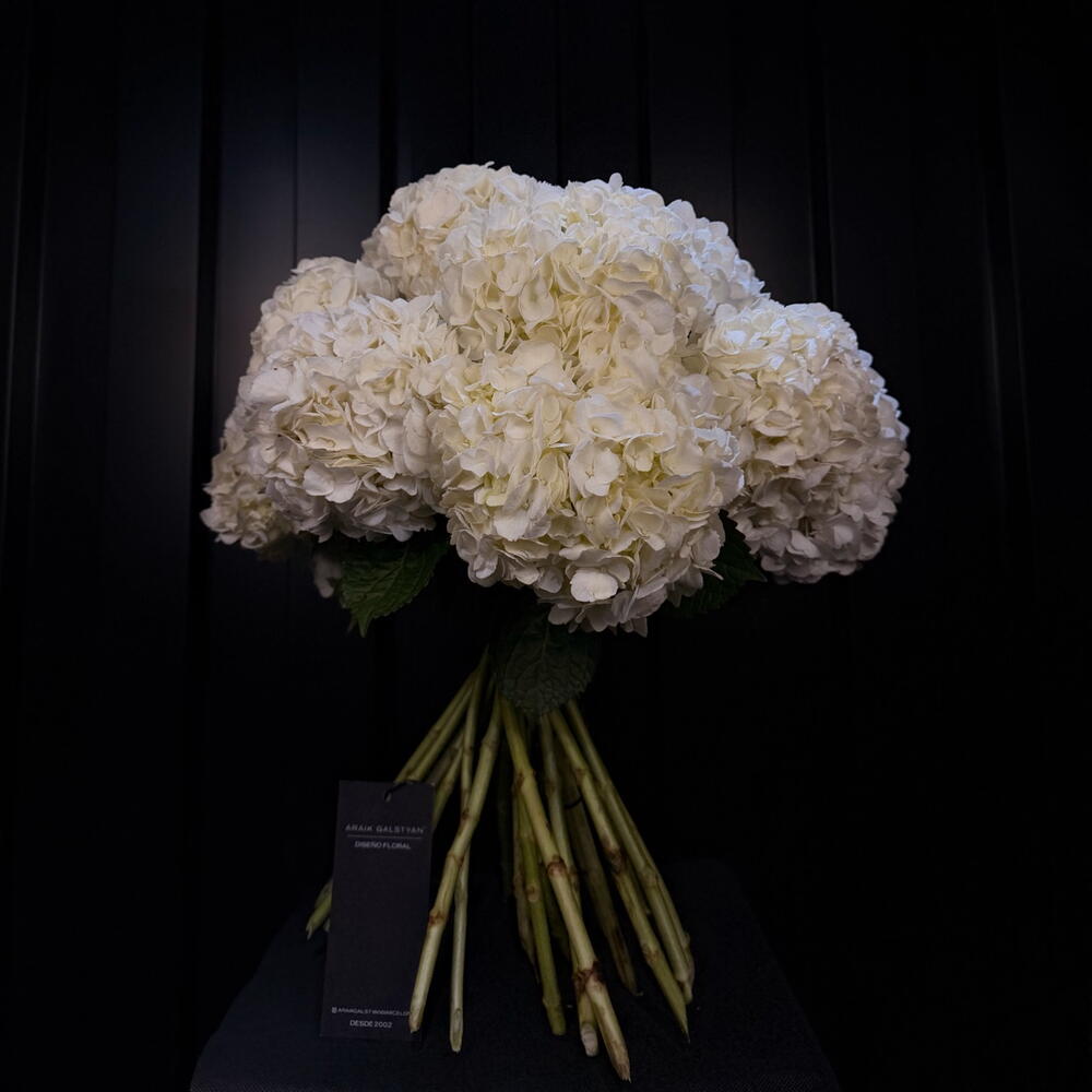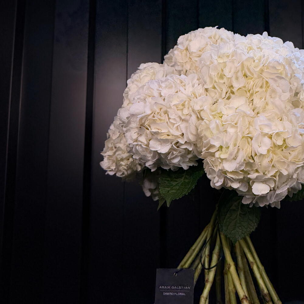 Un ramo majestuoso de hortensias blancas, puro y luminoso como una perla. Los voluminosos racimos florales crean una silueta elegante y sofisticada, mientras el ligero toque de follaje mantiene la naturalidad del diseño. Bajo la firma Araik Galstyan, esta composición simboliza pureza, respeto y belleza eterna — ideal para celebraciones especiales o para aportar un toque de luz y refinamiento a cualquier espacio.
