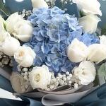 rosas blancas - 15 ud. verdes variados - 7 ud. paniculata o limonium blanco - 5 ud. hortensia azul - 3 ud.