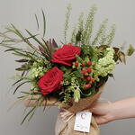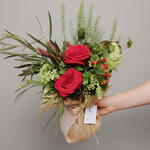 Este encantador arreglo floral combina la elegancia de las rosas rojas con la frescura de tonos verdes vibrantes. Las flores principales destacan por su intensidad y forma perfecta, aportando un toque romántico y sofisticado. El follaje variado y las pequeñas bayas rojas añaden textura y un aire silvestre irresistible. Los detalles en tonos verdes suaves equilibran la composición con naturalidad y armonía. La base envuelta en tela tipo yute aporta un encanto rústico y acogedor. Cada elemento ha sido cuidadosamente colocado para lograr un diseño equilibrado y lleno de vida. ¡Un detalle ideal para sorprender y embellecer cualquier ocasión especial!