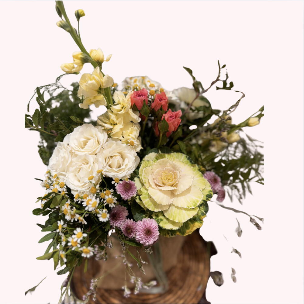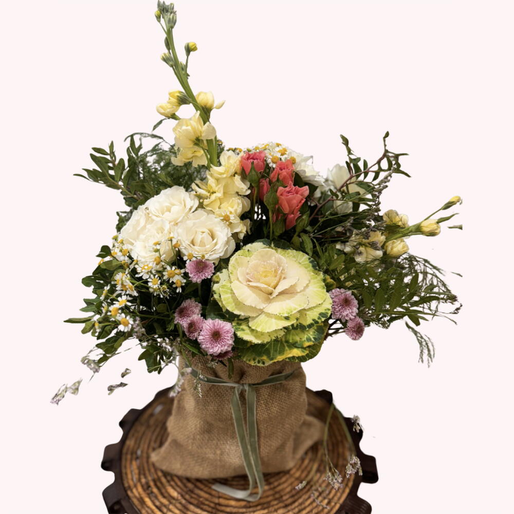 eucalipto - 1 ud. alhelí amarillo - 2 ud. manzanilla - 1 ud. ramaje salvaje - 1 ud. col ornamental - 1 ud. rosas blancas de jardin - 2 ud. crisantemos pequeños lilas - 2 ud.